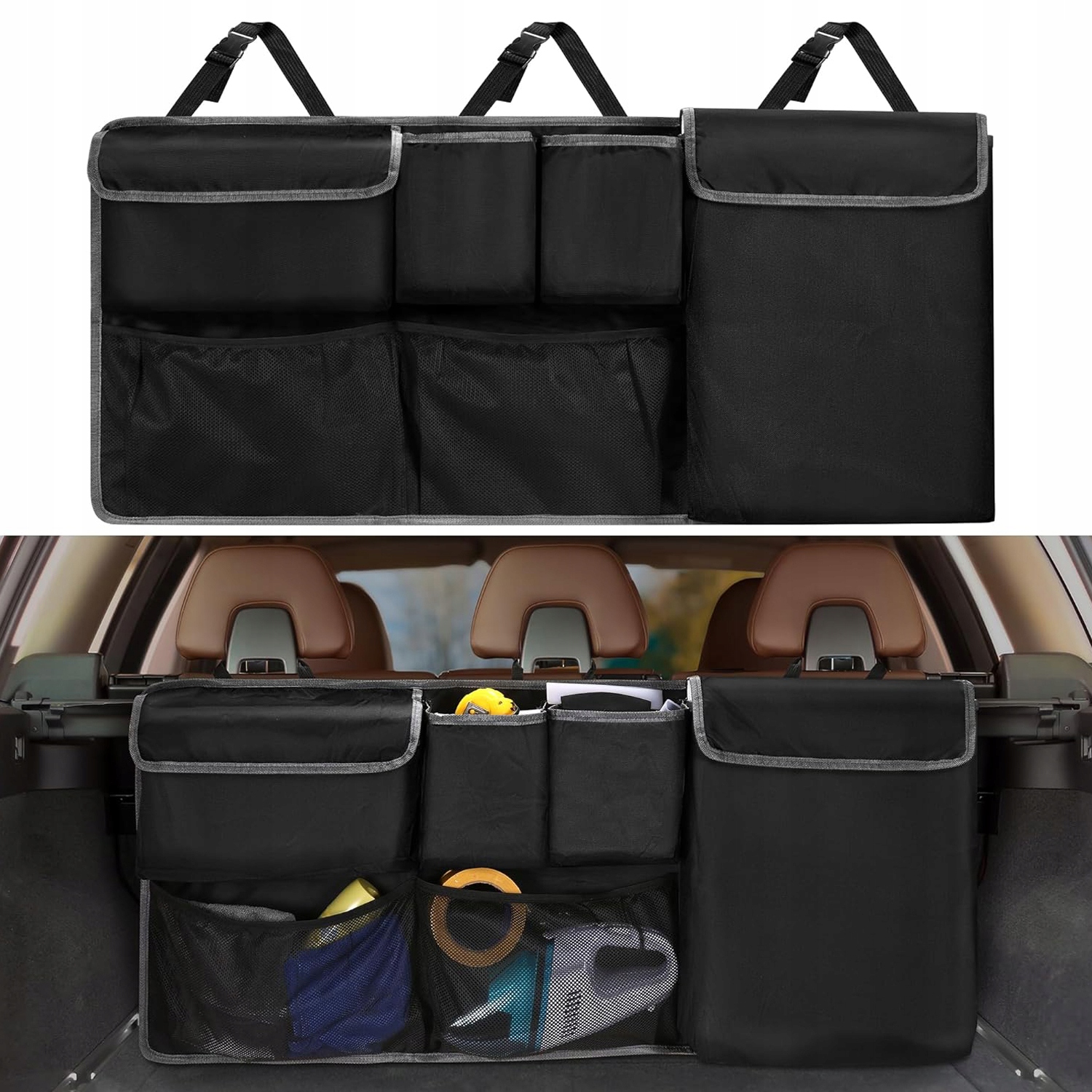 🚗 Організатор автомобіля має 6 кишень різного розміру, для задоволення різних потреб зберігання. Автомобільний багажник оснащений трьома регульованими ручками розміру, які дуже прості в встановленні, а на задній частині організатора багажу кріпиться дві магічні палички, щоб забезпечити його сильнішу фіксацію. З автомобільного магістралі використовується тканинний матеріал PVC 600D, Do Czyzczenia wystarczy Wilgotna ściereczka.