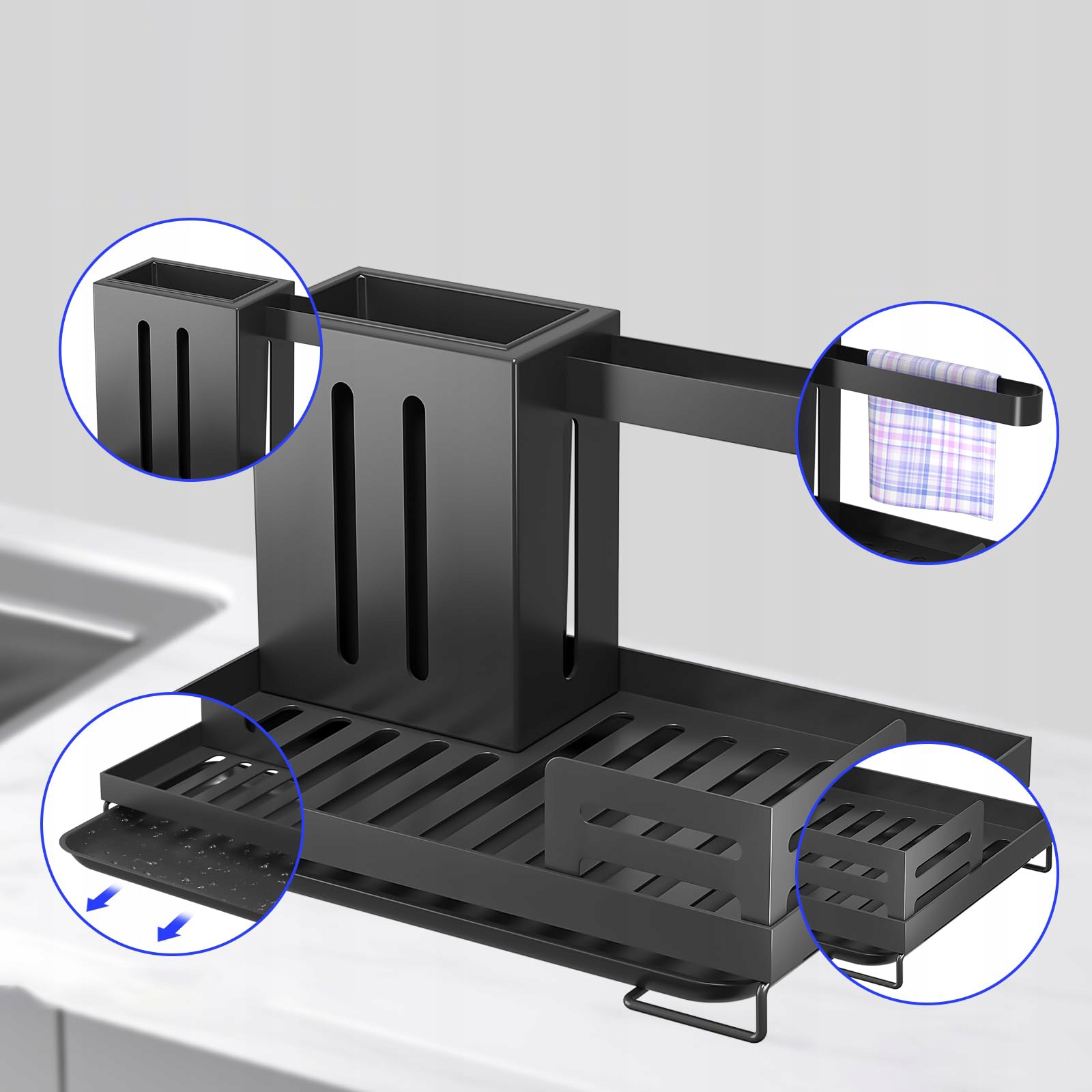 Чотири ніжки багатофункціональної сушарки для посуду оснащені протиковзким силіконом, який ускладнює ковзання при розміщенні на столі. У знімний піддон для крапель можна помістити губки, ганчірки тощо. Тримайте стільницю сухою.