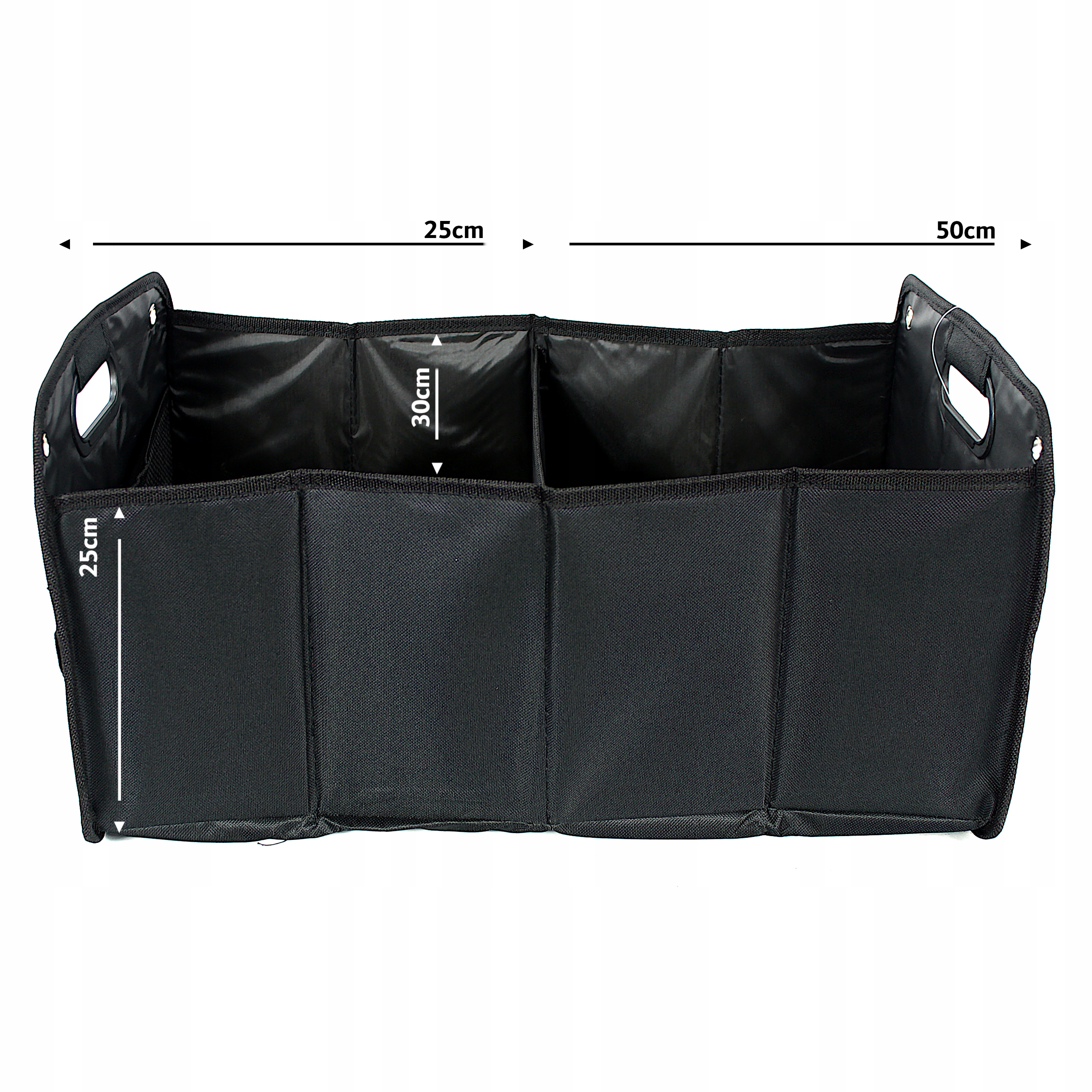 Складний, 2 відділення з килимками внизу, 1 сітчаста кишеня, 2 ручки для перенесення, з липучками внизу для кращого прилягання до підлога багажника та 4 металеві петлі для додаткового кріплення. Завдяки еластичному ремінцю його можна скласти, щоб заощадити місце, коли він не використовується.