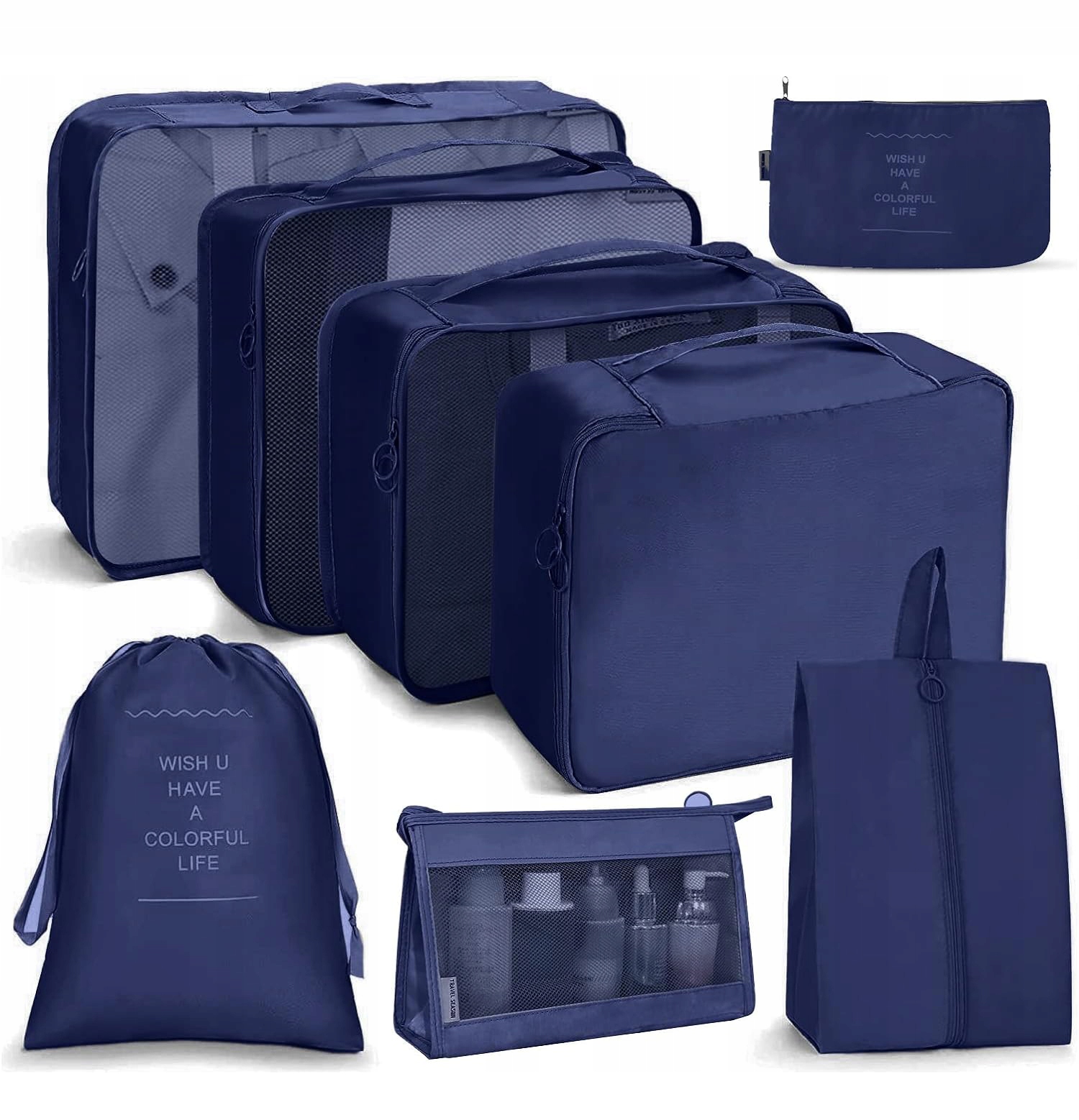 Набір містить упаковку з 3 кубиками з прозорим сітчастим верхом для одягу, 1 прихованим кубиком для бюстгальтерів і нижньої білизни, 1 дорожньою сумкою для взуття, 1 туалетною сумкою, 1 сумкою для білизни для брудного одягу та 1 плоскою сумкою для меншого одягу, наприклад шкарпеток, а також електронних аксесуарів або ключів.