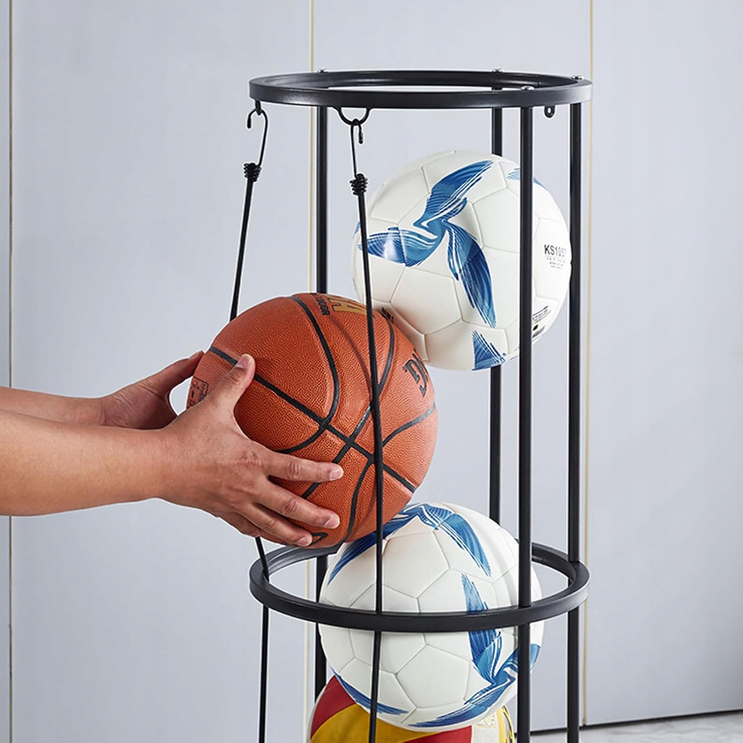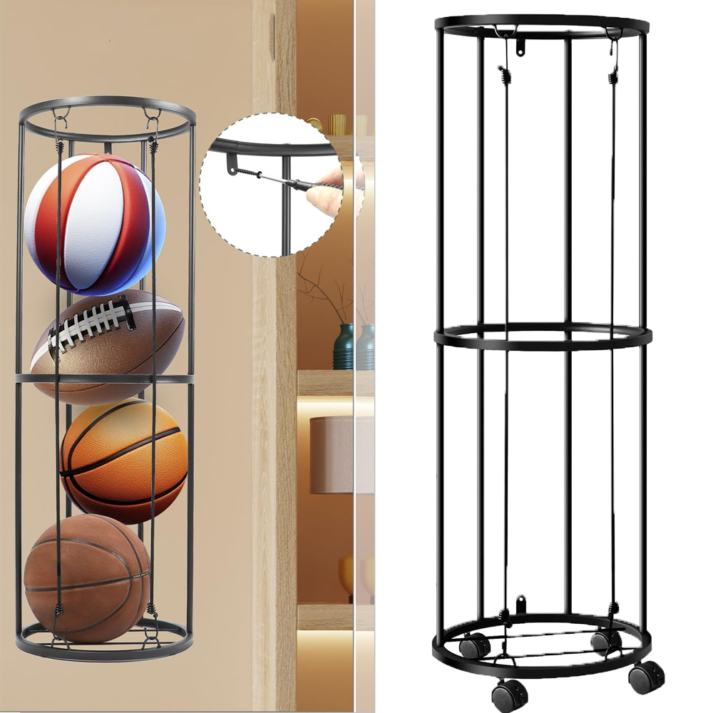 -Кіліндрична форма з великим місцем для зберігання, що підходить для зберігання баскетболу, футболу, волейболу та інших м'ячів. Сталь, стійкий, стійкий до корозії, непросто для іржі або перелому, і витримує тривале використання.