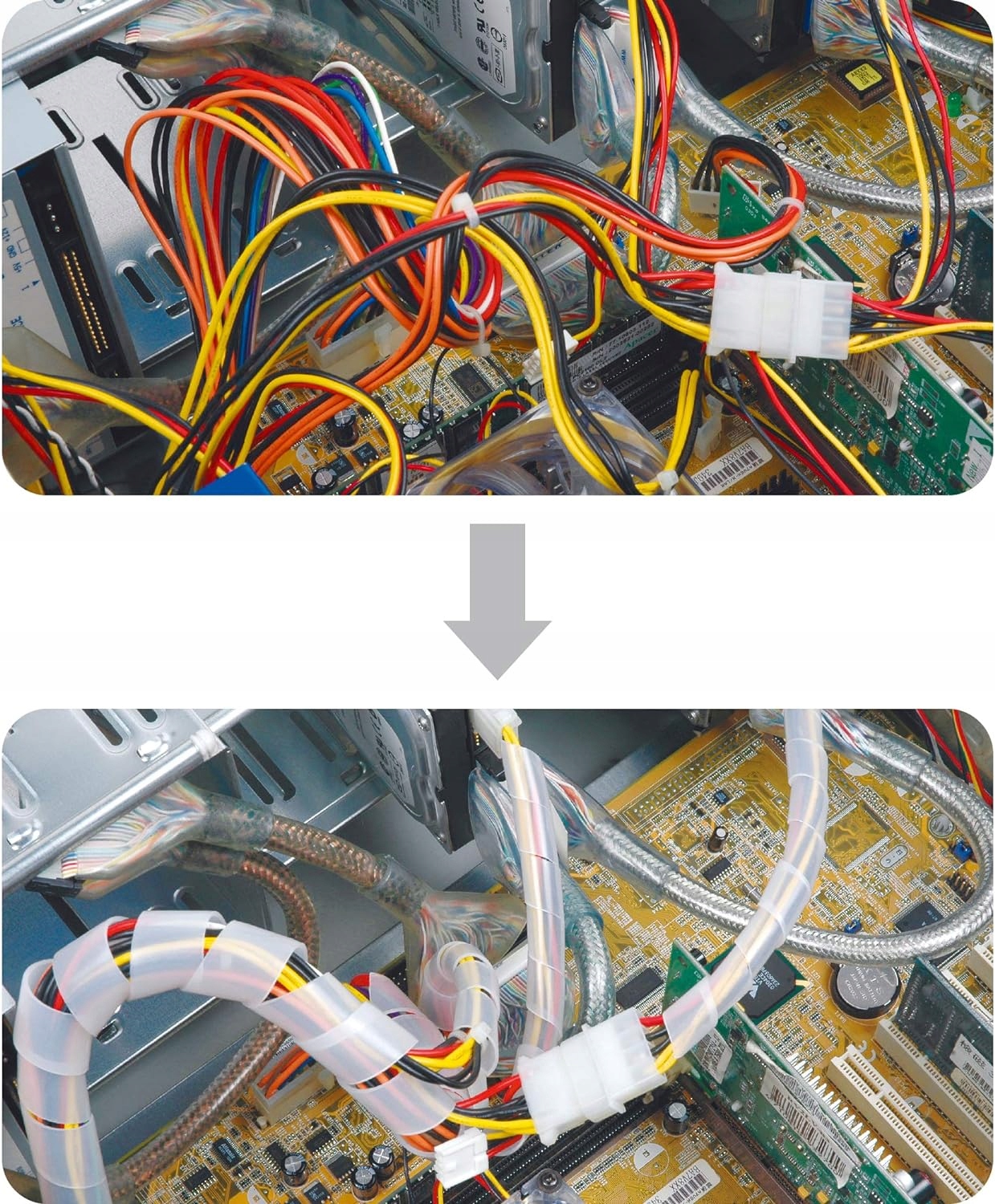 - спіральний 1 метр діаметром 16 мм, який може легко підходити до декількох товсті кабелі, таких як кабелі живлення 230 В або монітор або телевізійні кабелі. 4 Крім того, він чудово працює в тому, щоб запобігти натисканням кабелів від миші, клавіатури тощо