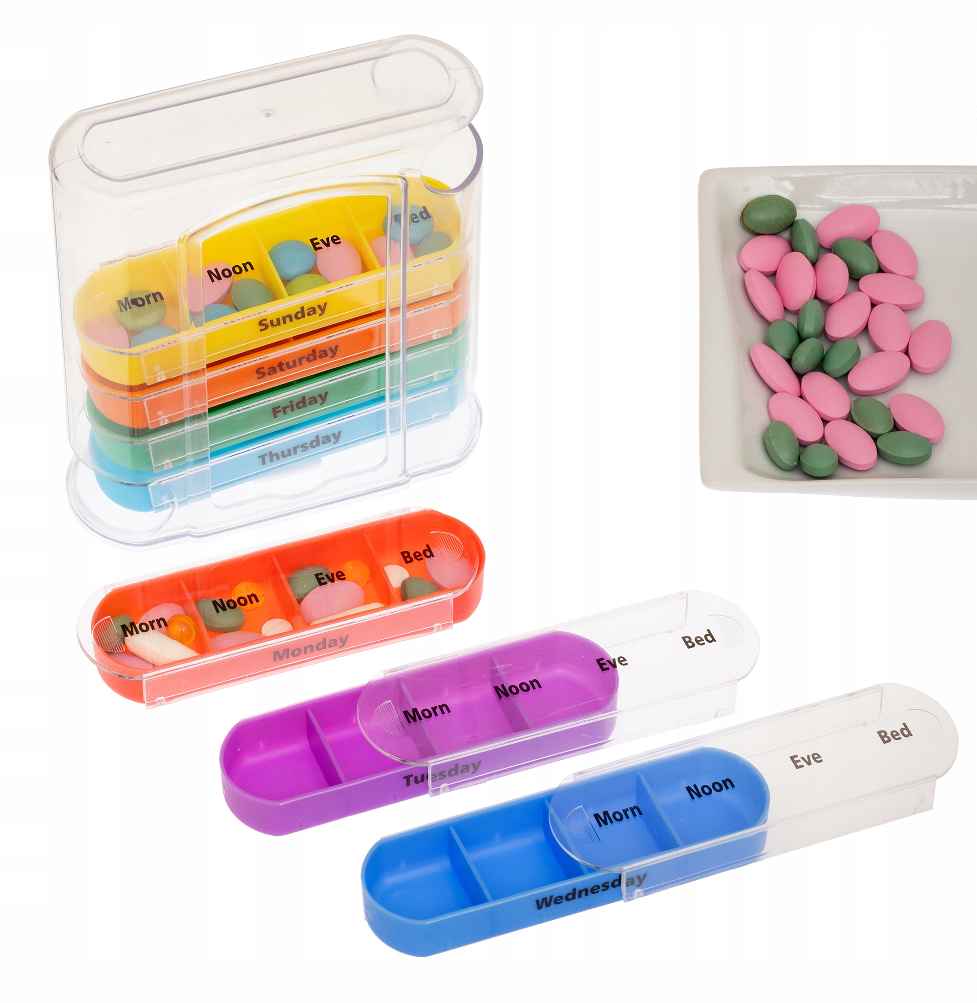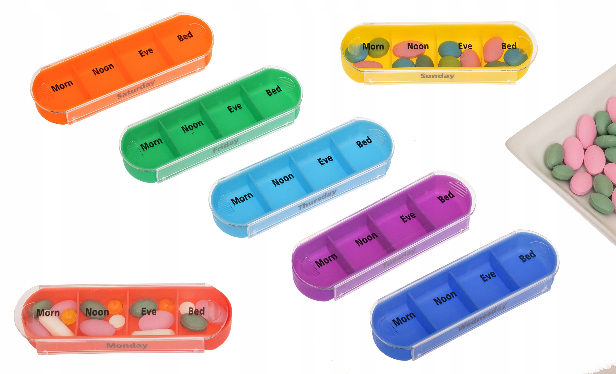Практичний контейнер, касета медицини. організатор дозволяє вам зручно розподіляти ліки на кожен день тижня, а для чотирьох часів доби протягом наступні 7 днів.