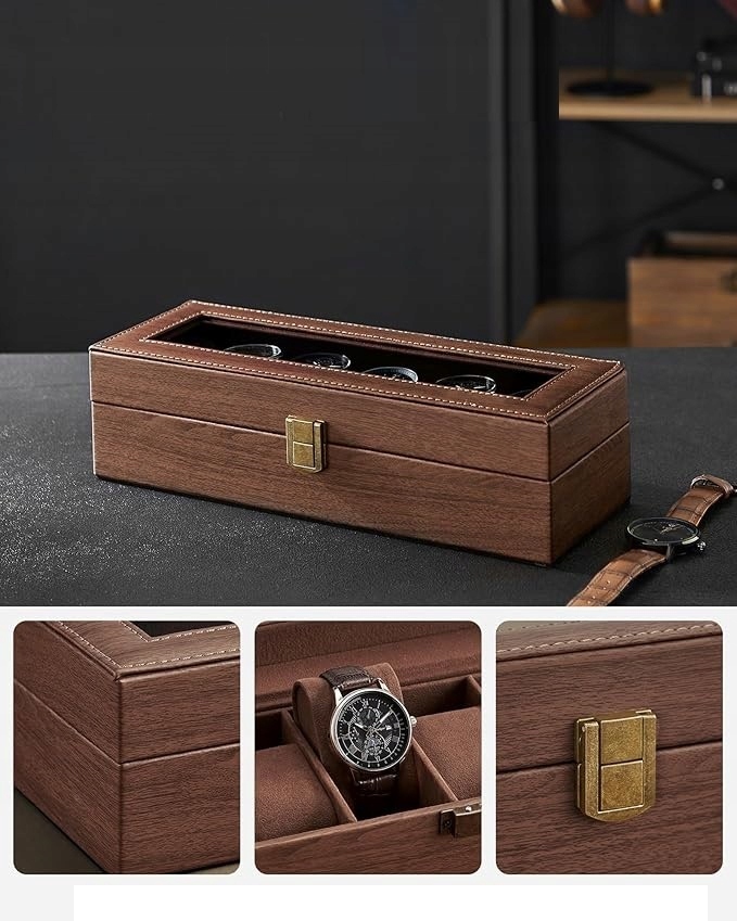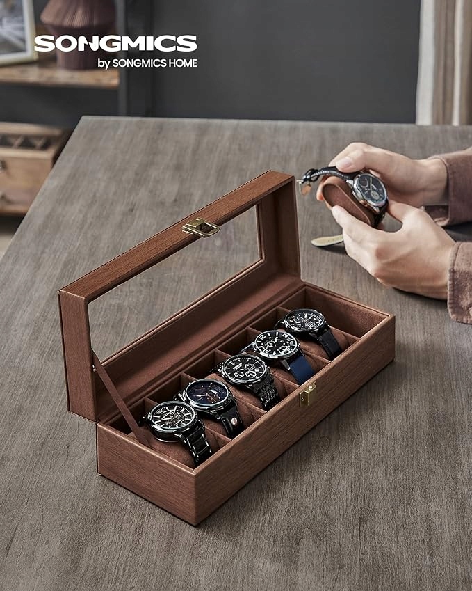 - 6 Відсік: Кожен з них, набитий м'яким матеріалом, який захищає годинники від подряпин та пошкодження. B> Прозора кришка: дозволяє легко переглянути вміст, захищаючи годинники від пилу. Простір - від шафи після офісу.