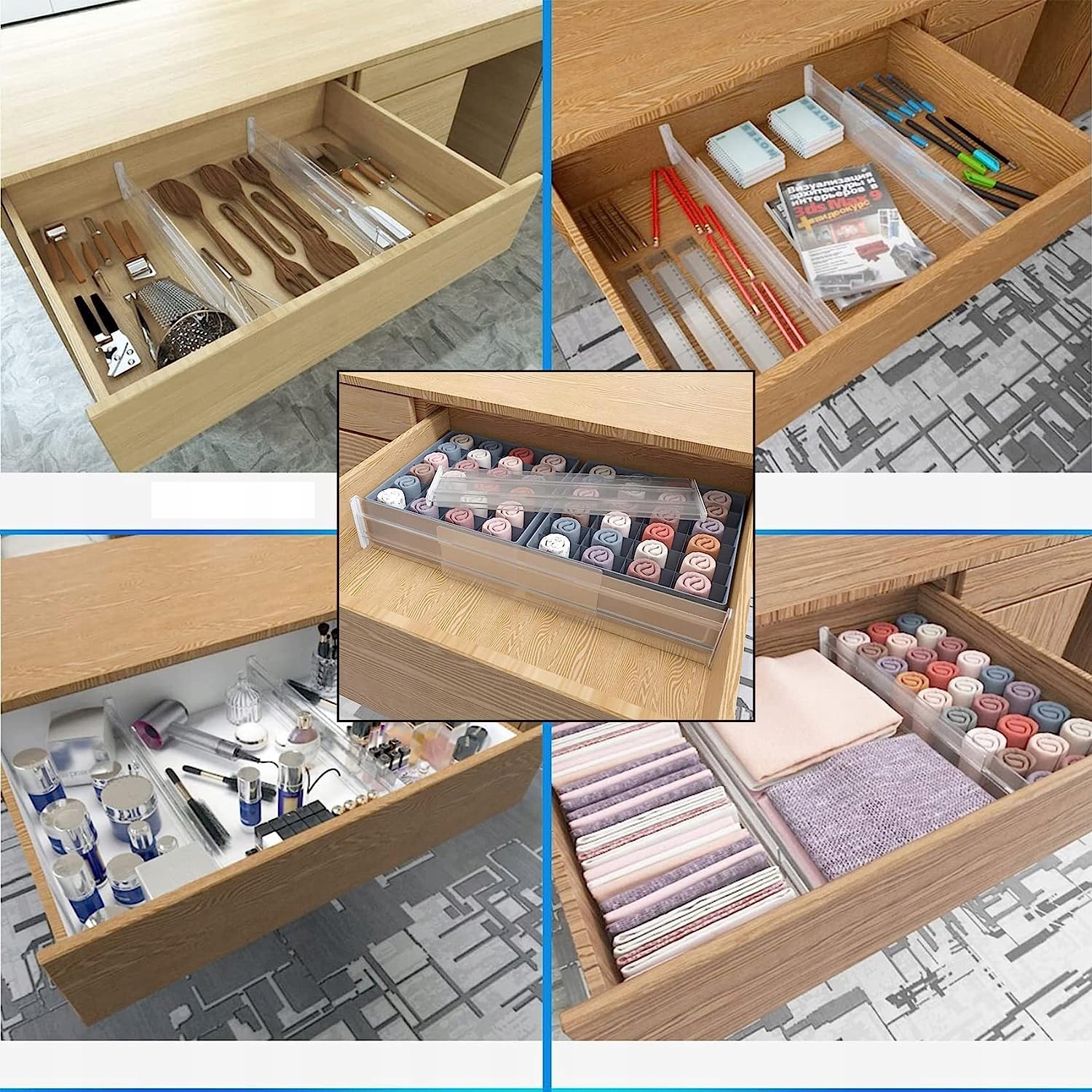 ✔️【Багатофункціональні перегородки для ящиків】: Використовуйте їх, щоб створити індивідуальний простір для зберігання ящиків у будь-якому місці. Чудово підходить для організації роздільників ящиків і легкого пошуку того, що вам потрібно. Ідеально підходить для впорядкування шухляд із сміттям, одягом, кухонним приладдям, канцелярським приладдям, косметикою, безладом у ванній кімнаті тощо.