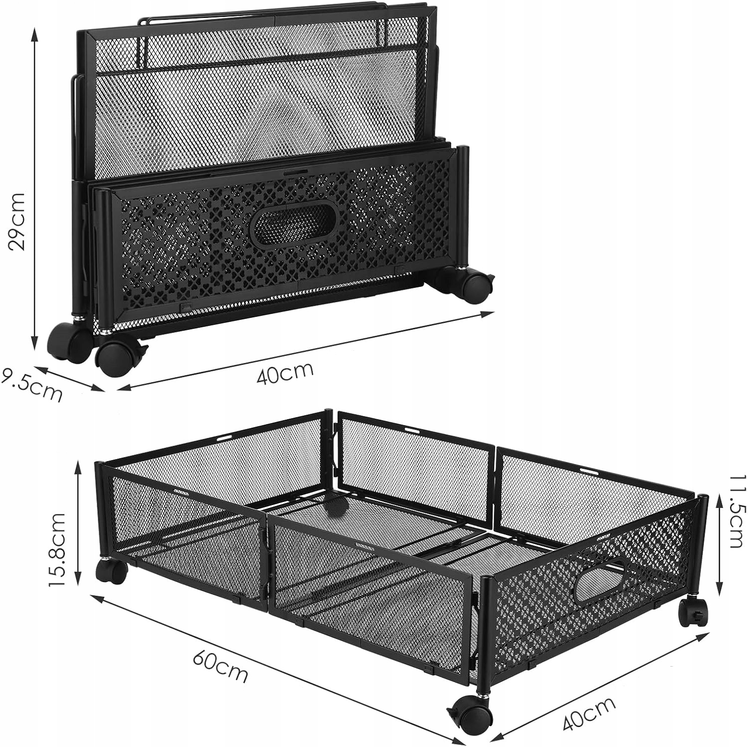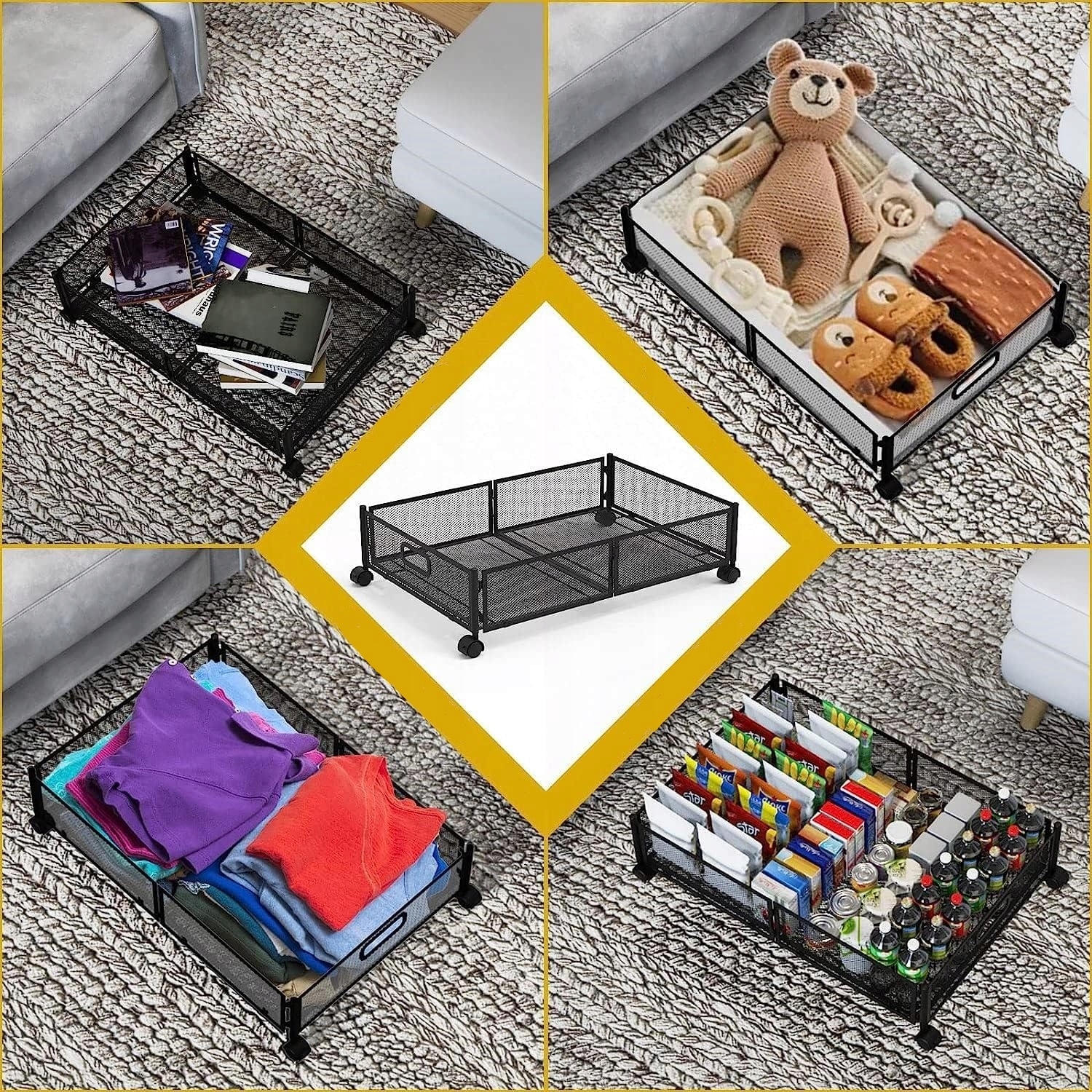Високоякісне зберігання під ліжком: Зберігання під ліжком виготовляється з високоякісних металевих матеріалів, які є більш міцними та мають кращу здатність навантаження порівняно з традиційними делікатними пластмасами та невенними матеріалами. Крім того, весь кадр встановлений в одному елементі, який ніколи не відокремлюється. Бічна сітка була вдосконалена, а отвори були зменшені, щоб запобігти падінню продукту. Ці колеса дуже гладкі і тихі. Завдяки колесам їх можна легко перемістити на підлогу та килим, навіть завантажений. Два з чотирьох коліс можна заблокувати, натиснувши кнопку у верхній частині візки. Підвищена конструкція може захищати збережені предмети від бруду. Коли він не використовується, його можна скласти, тим самим заощаджуючи місце. Ви можете зберігати в них багато речей, а контейнери для зберігання під ліжком допомагають заощадити більше місця в гардеробі. Їх можна розмістити під столом, диваном або телевізором. У цих контейнерах ви можете зберігати додатковий одяг, книги, іграшки або взуття, які більше не потрібні в даному сезоні. Вам не потрібні жодних інструментів. Враховуючи складність складання, ми спрощуємо установку до двох простих кроків. Просто покладіть чотири колеса на рамку, а потім поставте раму наверху. Встановлення триває одну хвилину і не потребує використання інструментів.