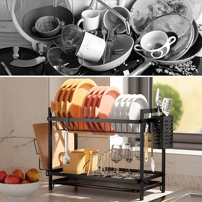 Завдяки двом рівням ви можете одночасно висушити велику кількість страв, включаючи тарілки, чашки, столові прибори та горщики. посуд.