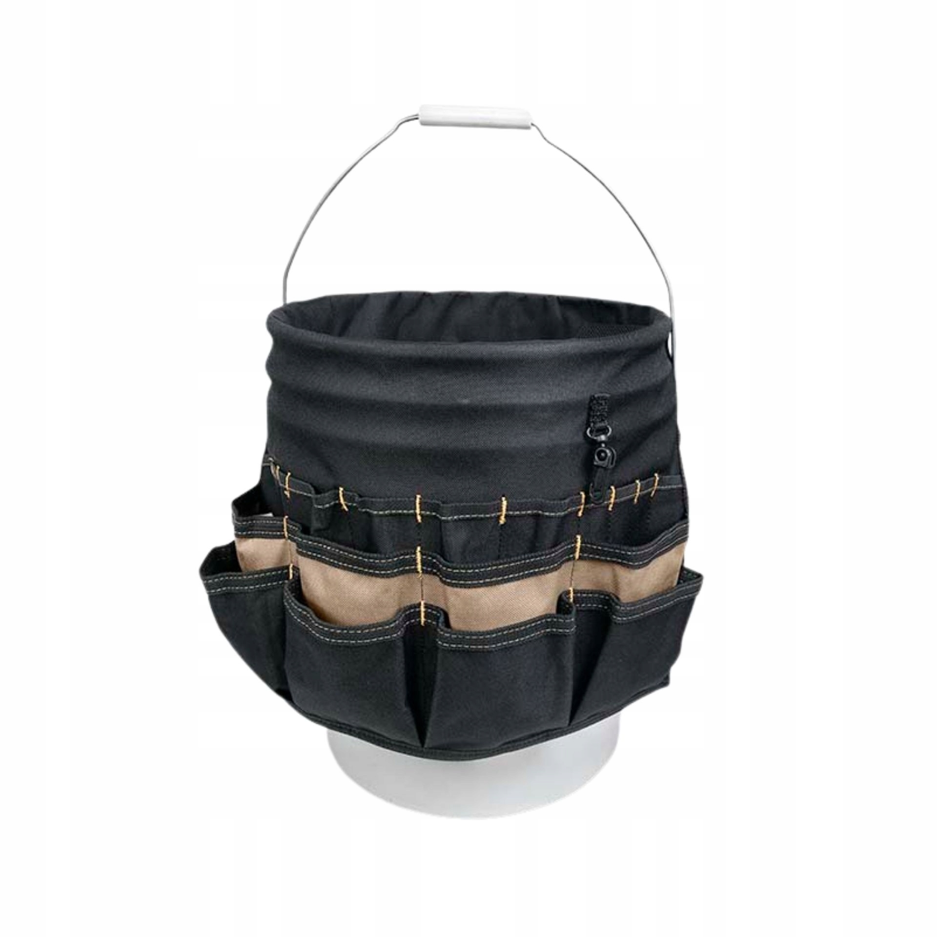 Цей високоякісний підрядник-органайзер для відер із 14 дворядними внутрішніми кишенями та 34 трирядними зовнішніми кишенями, містить стрічкову петлю, кишеню для акумуляторної дрилі та ремінь безпеки. Кілька внутрішніх і зовнішніх кишень дозволяють оптимально розмістити широкий спектр інструментів і аксесуарів. Кишеня для свердла з ремінцем на липучці.
