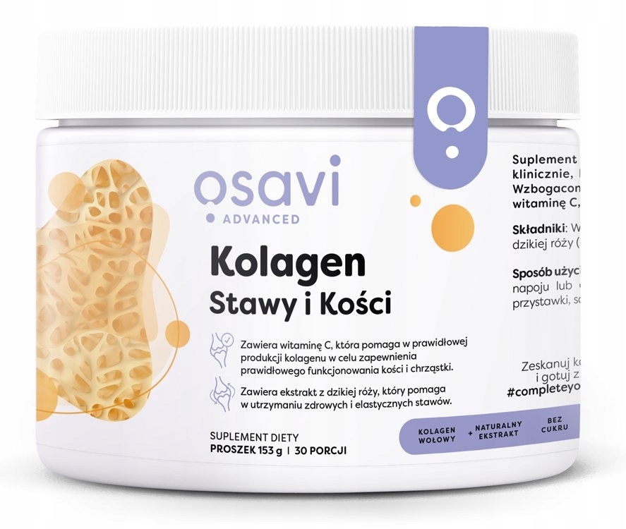 Осаві колаген для суглобів та кістки містить 30 порцій колагену, що складаються з біоактивних пептидів колагену Fortibone® та дикого екстракту, стандартизованого до вмісту вітаміну С 70% С. Дослідження підтверджують, що пептиди колагену Fortibone® сприяють збільшенню щільності кісток та обмеженні процесів щільності колагену. Запатентовані пептиди забезпечують амінокислоти як цінні будівельні блоки. Включення екстракту дикої троянди та вітаміну С, що міститься в ньому, сприяє належному виробленню колагену та підтримці хорошої рухливості суглобів. Завдяки своїй формулі, добавка для колагену буде особливо корисною для людей, які займаються більш спортом, а також для людей похилого віку. Завдяки простому формі подачі та нейтралітету для смакових рецепторів ви можете використовувати її для приготування багатьох різних страв. Він ідеально розчиняється у воді, соках, коктейлях, але це також може бути доповненням до страв. Використання колагену в цій формі буде простим і приємним способом забезпечити собі потрібну кількість цього важливого білка.