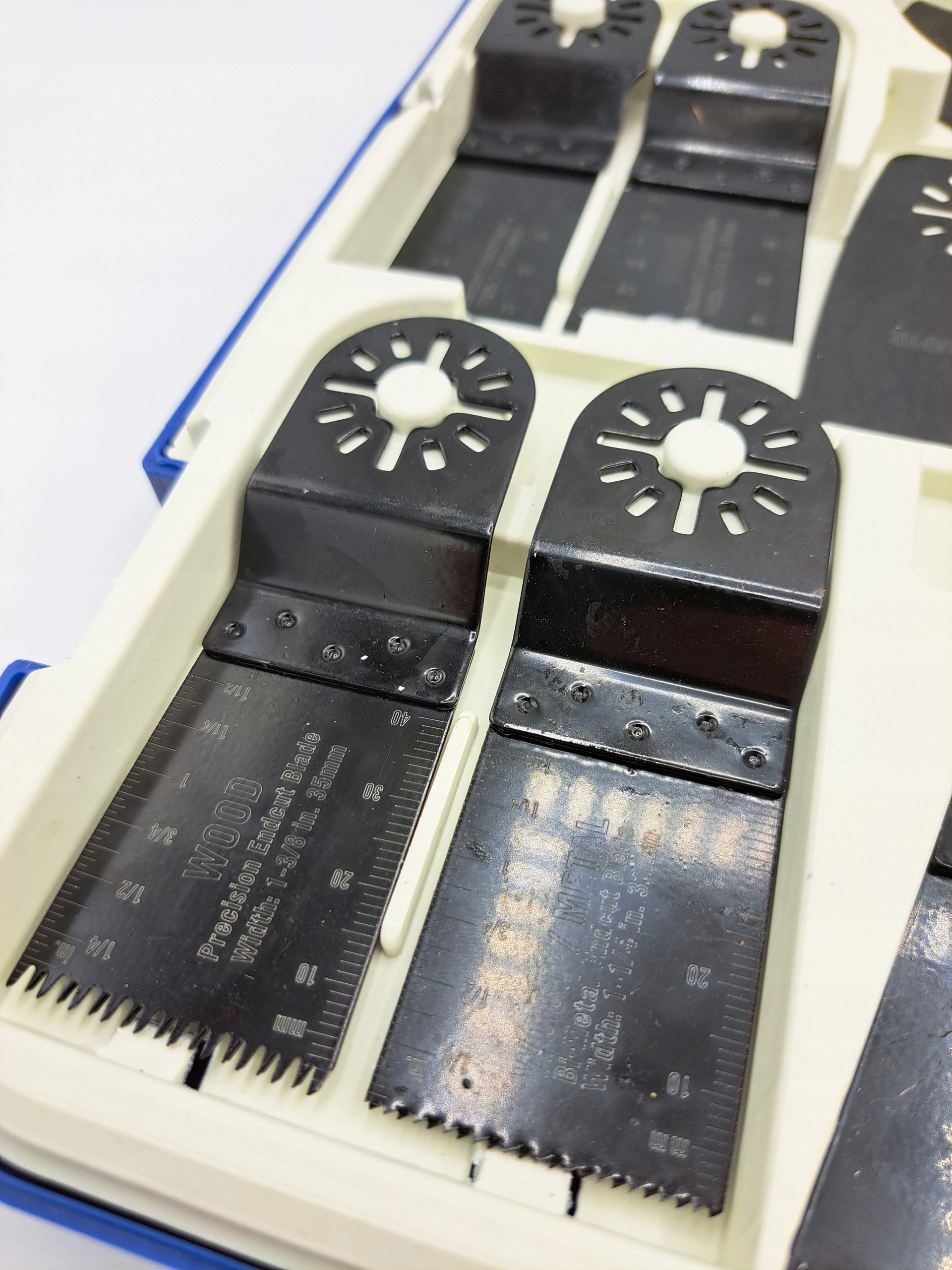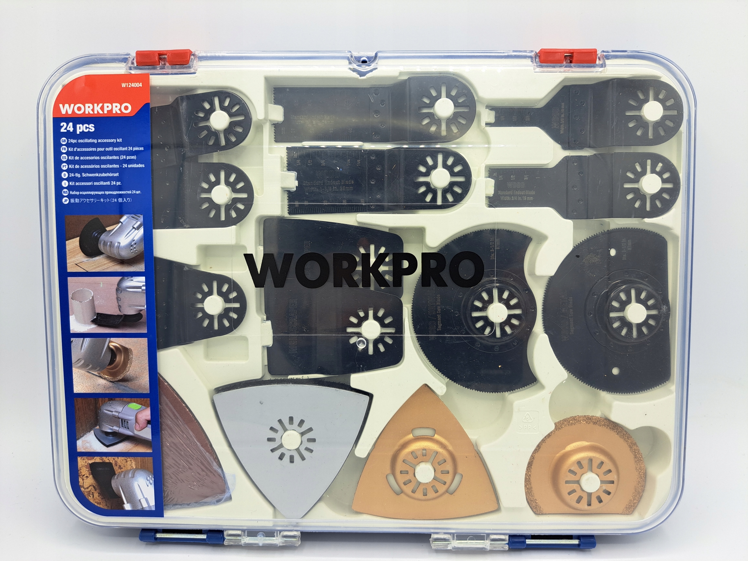 - Набір осцилюючих аксесуарів із 24 частин: Цей високоякісний набір включає в себе все, що може забажати користувач мультиінструменту, як-от полотно для пилки по дереву/металу, шліфувальну пластину, наждачний папір і скребок.