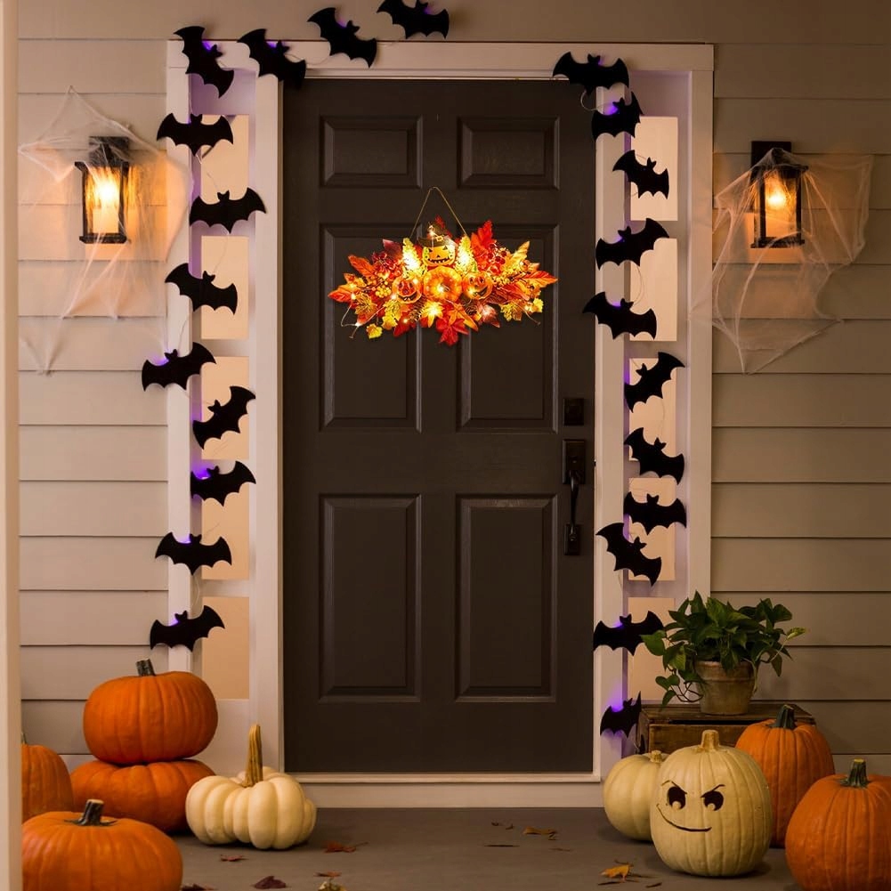 Легко прикрасити: Кожен прикраса на Хеллоуїн має білизковий кабель, щоб повісити де завгодно, він може сформуватися, щоб він відповідав кожному осені місця оздоблення будинку та Хеллоуїна. Ви можете використовувати його для прикраси вхідних дверей, стін, вікон, каміна, дверей, поруків для сходів тощо, додавання атмосфери подяки та Хеллоуїна до космічних дверей штучні літні літні вінки Зелені квітки Еукіфіль Евкаліпт Квітковий лист -лондера Lavenda Квітки Реалістичний сезон Homekaren
