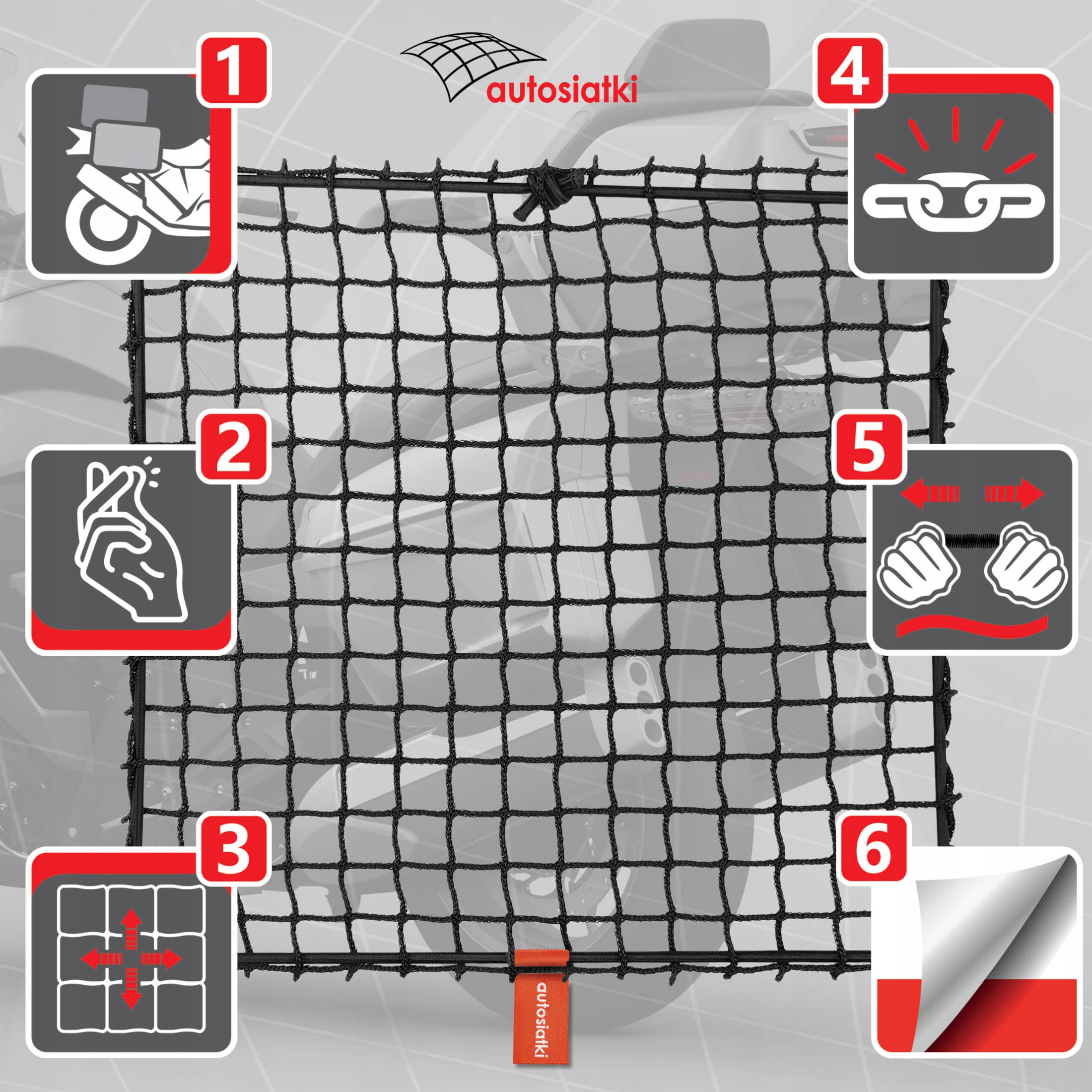Міцна сітка з гумовою опліткою. Встановлюється на заводські ручки у верхній кришці корпусу. Це допомагає використати додатковий простір для багажу, стабілізує менші аксесуари та покращує організацію простору в багажнику.