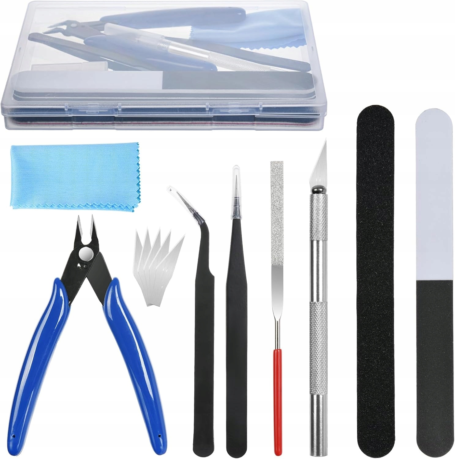⑤Набір інструментів своїми руками. Набір інструментів для моделювання включає 1 пластикову коробку, 1 діагональні плоскогубці, 2 пінцети, 1 різьбовий ніж і 5 ножів, 2 полірувальні стрижні, 1 напилок, 1 тканину. Достатній для щоденного використання, це економічний стартовий набір для мініатюрних і масштабних моделей Gundam.