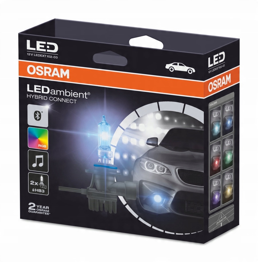 Світлодіодні продукти, що змінюють колір у складі та підтримка Ledambient Hybrid Connect-це стриману систему, яка є заміною існуючих ламп у фара. Вони є поєднанням біліших, високоефективних галогенних цибулин зі світлодіодним світлом, що змінює кольори. Після підключення через Bluetooth з безкоштовним додатком Application Osram Ledambient Connect, ми отримуємо можливість керувати кольорами, режимом та пульсуючим світлом до ритму музики. Osram надає 2-річну гарантію на Ledambient Hybrid Connect. Ці продукти не мають схвалення ECE. Це означає, що вони не повинні використовуватися при зовнішньому освітленні в транспортних засобах, що рухаються по громадських дорогах.