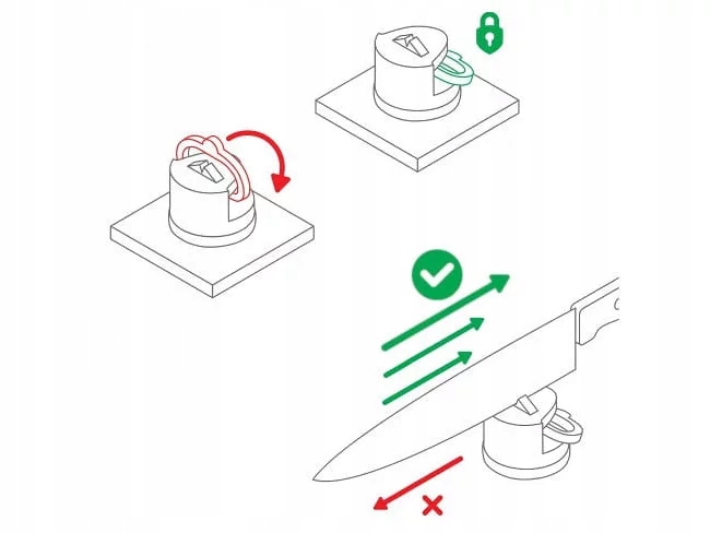 Зручність використання точильної точильки Anysharp забезпечується основою з сильною вакуумною присосною чашкою, яка дозволяє стабільно кріпляти кам'яний камінь до гладкого скла, металу, керамічної та пластикової поверхні.