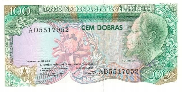 Держава та Unine Docras 100 Dobras Material Paper розміром 135 х 67 мм Каталог P-60 Різний рік 1989 р.
