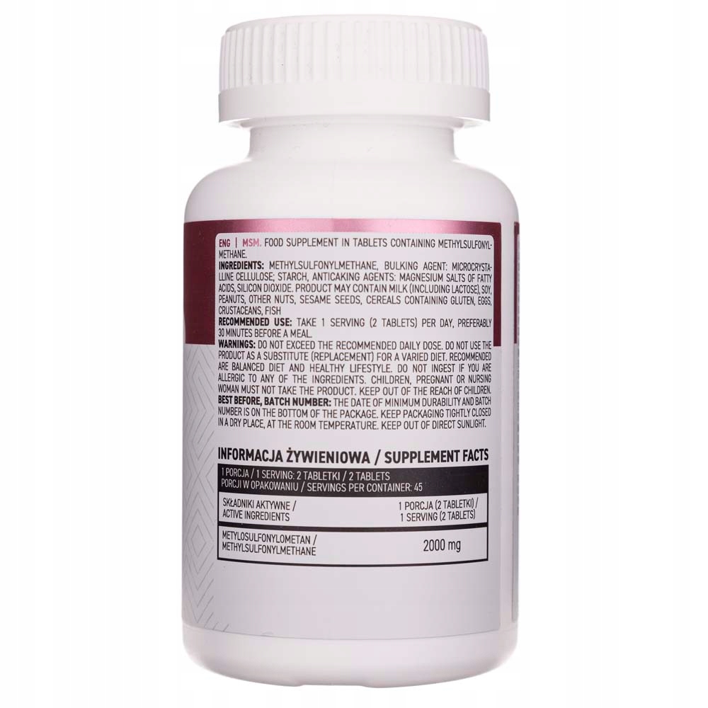 Метилсульфонілметан, наповнювач: целюлоза мікрокристалічна; крохмаль, антизлежувачі: діоксид кремнію, магнієві солі жирних кислот.