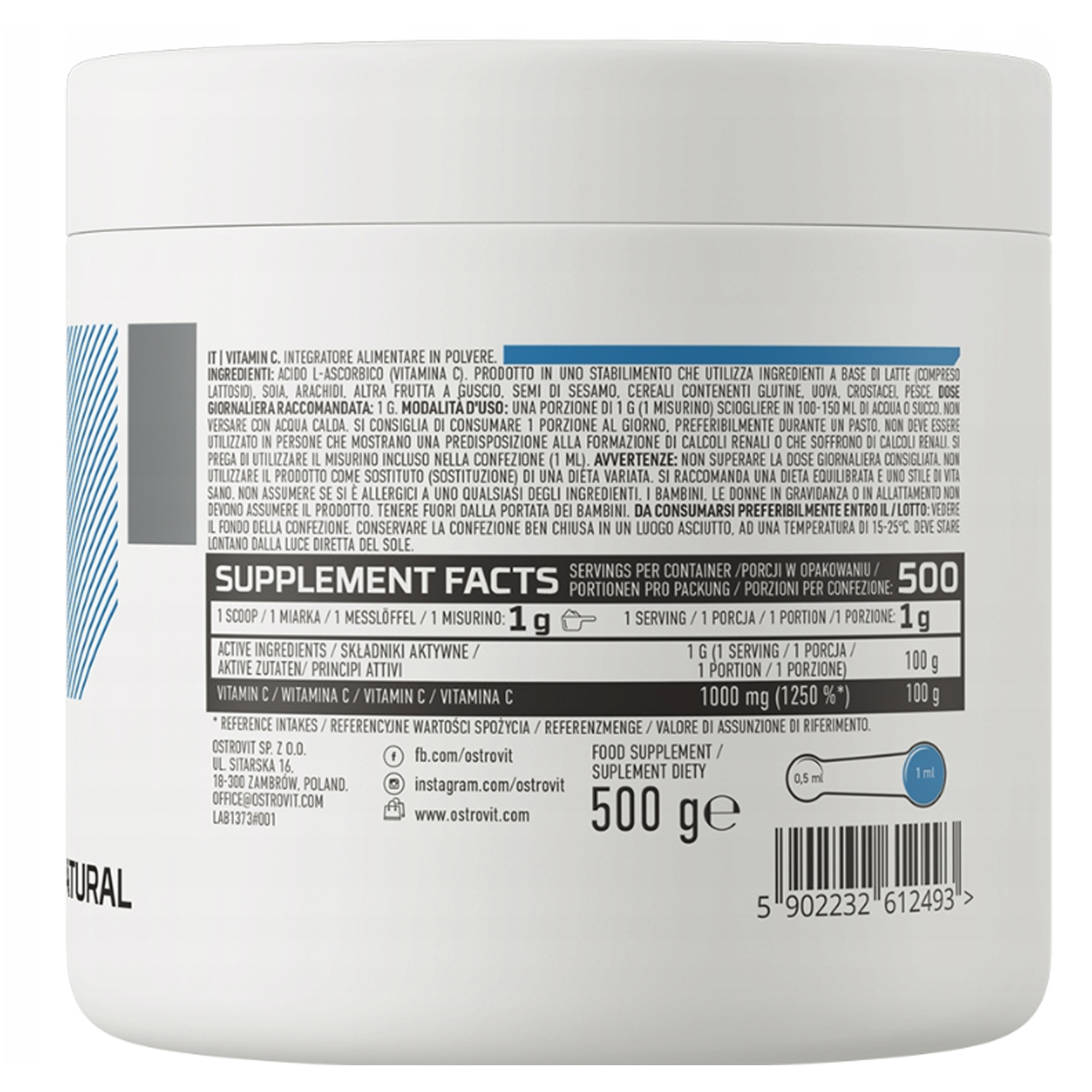 (500 порцій по 1000 мг кожна)-це добре вдосконалена вітамін С (L-аскорбінова кислота) у порошку з найвищою чистотою. Продукт багато в чому неперевершений порівняно з широко доступними препаратами, особливо в таблетках, з низькими концентраціями вітаміну C. Ostrovit Supreme Pure Vitamin C може бути вільно дозованою, наприклад. взявши величезну дозу 1000 мг або половину. Продукт спрямований як на конкурентоспроможних спортсменів, активних людей, так і кожного, хто піклується про зміцнення власного імунітету та збереження хорошої форми та здоров'я, в тому числі для людей похилого віку та дітей.