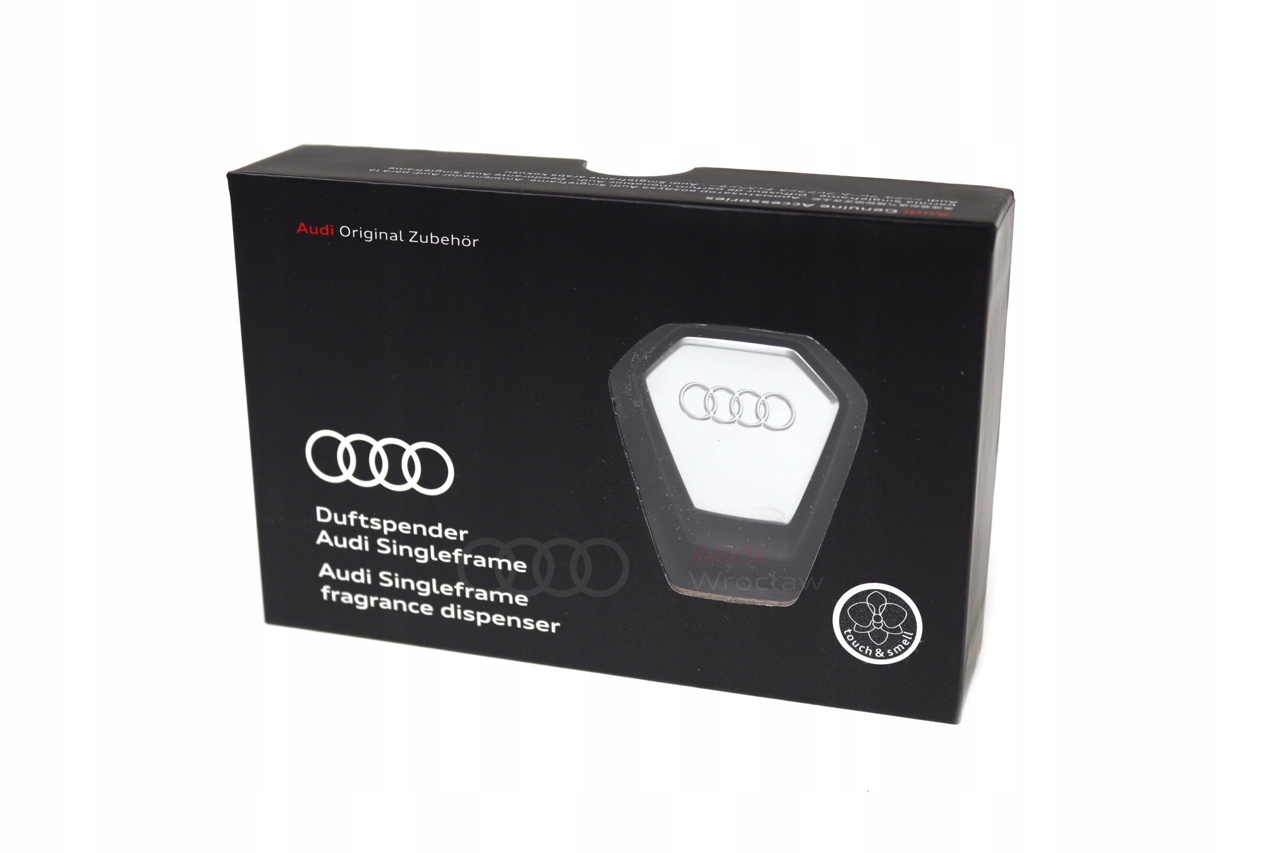 Освіжувач повітря можна швидко та легко розмістити на ребрах вентиляційних отворів. Він складається з ароматизованого полімеру з інтегрованими молекулами аромату. Освіжувач повітря в характерній для Audi однорамній конструкції забезпечує салон приємним ароматом до 45 днів. Чорна ароматична вставка зі східним ароматом на основі суміші бергамоту, лаванди, екзотичних квітів, сандалового дерева і заспокійливого мускусу. Інтенсивність аромату можна легко та індивідуально регулювати, регулюючи вставку алюмінієвого кольору. За потреби ароматичну паличку можна легко вийняти та замінити новою. Ви можете вибрати герб із 3 ароматичних наповнювачів.
