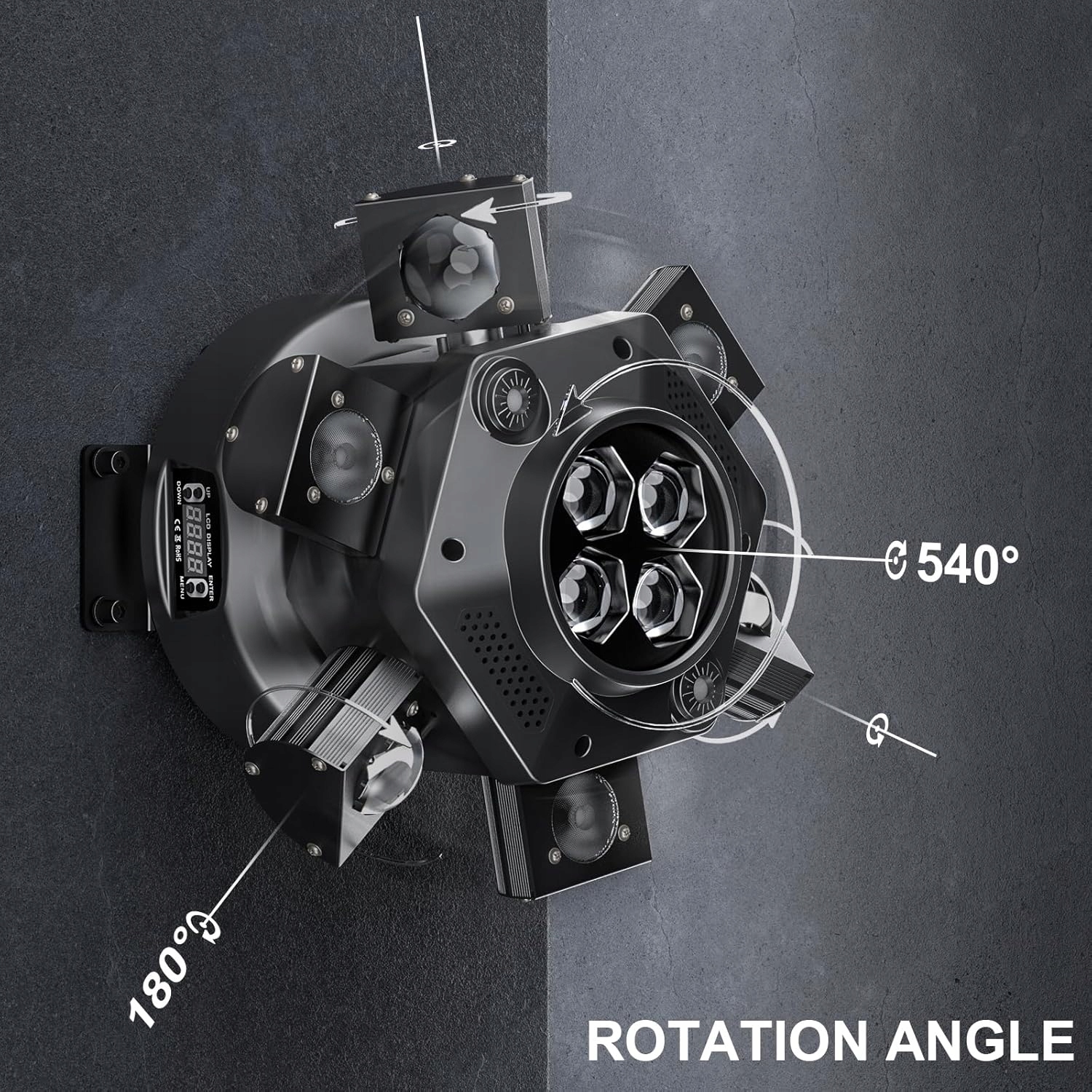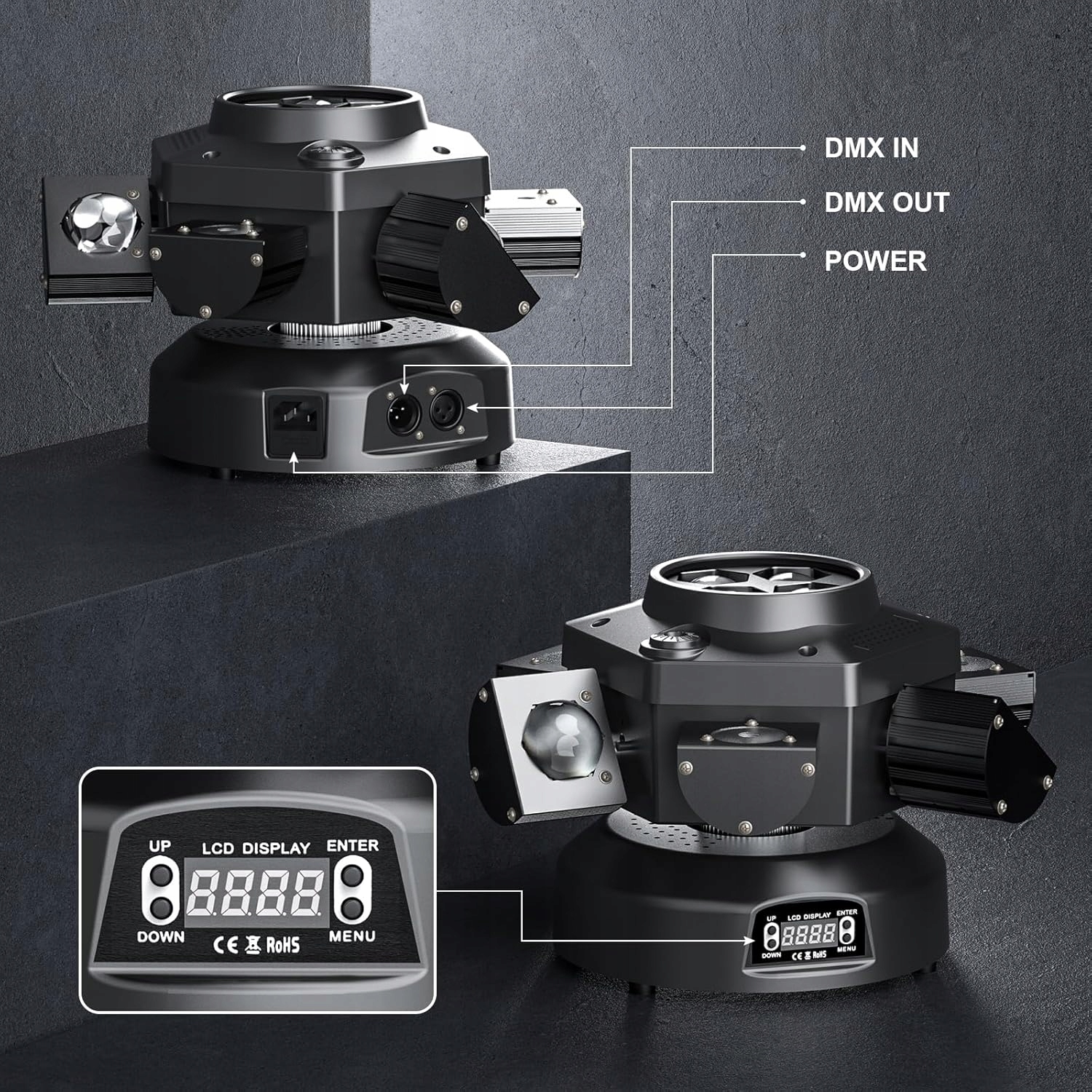 - 【Кут повороту】4 світлодіодні лампи в центрі рухомої голови можна плавно обертати на 360°, 3 плеча RGB-потоку можна обертати на 180°, вісь X: 540°, інші 3 плеча не повертаються. Швидкість обертання світла вечірки, швидкість світлового ефекту та чутливість керування звуком регулюються. Ви можете створити просторовий ефект як світла, так і тіні, і світловий ефект охопить велику площу.