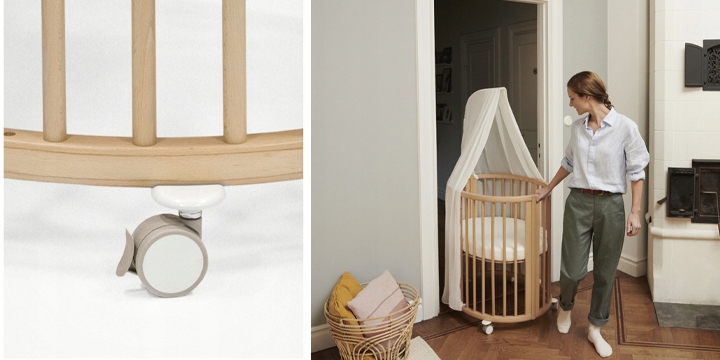 Каркас ліжка встановлений на поворотні колеса, які в розблокованому стані дозволять переміщати ліжко по всій квартирі. Якщо вашій дитині важко заснути після пробудження, ви можете її обережно покачати. Ширина Stokke Sleepi Mini V3 становить лише 67 см, тому він легко пройде в двері більшості квартир.