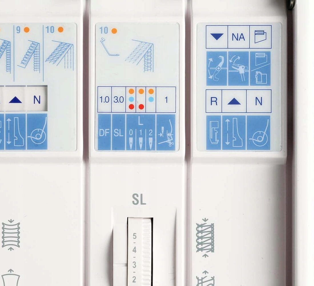 - 20 доступних програм стібків, зокрема: 3-, 4-, 5-ниточні оверлочні стібки, 2-ниточні ланцюгові стібки, 2- та 3-голкові сходи, декоративні сходи (з верхнім переплетенням)