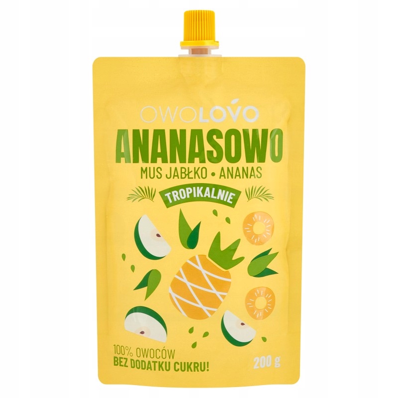 Яблуко та ананасовий мус. Пастеризований продукт. Без додавання цукру - містить природні цукру. Фруктовий мус OWOLOVO Спеціально для вас ми створили унікальне поєднання сонячних тропіків і польської солодкості. Насолоджуйтесь свіжістю та натуральним смаком яблука та ананаса. Дозвольте себе здивувати цим екзотичним задоволенням, виготовленим із 100% фруктів!