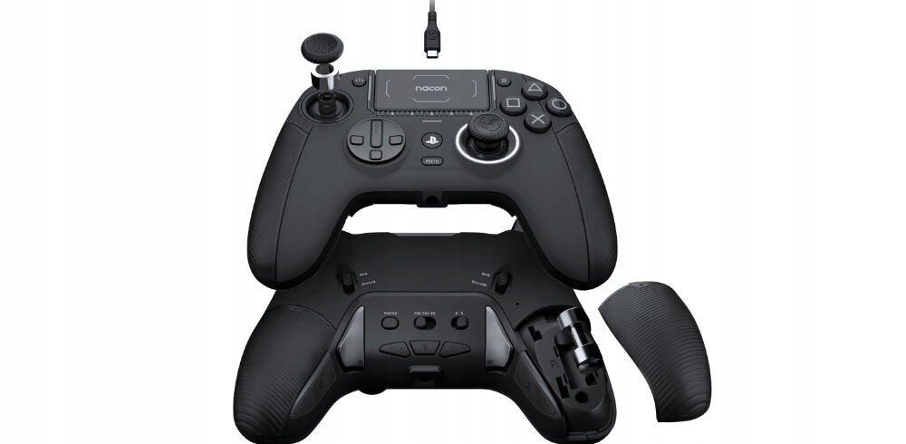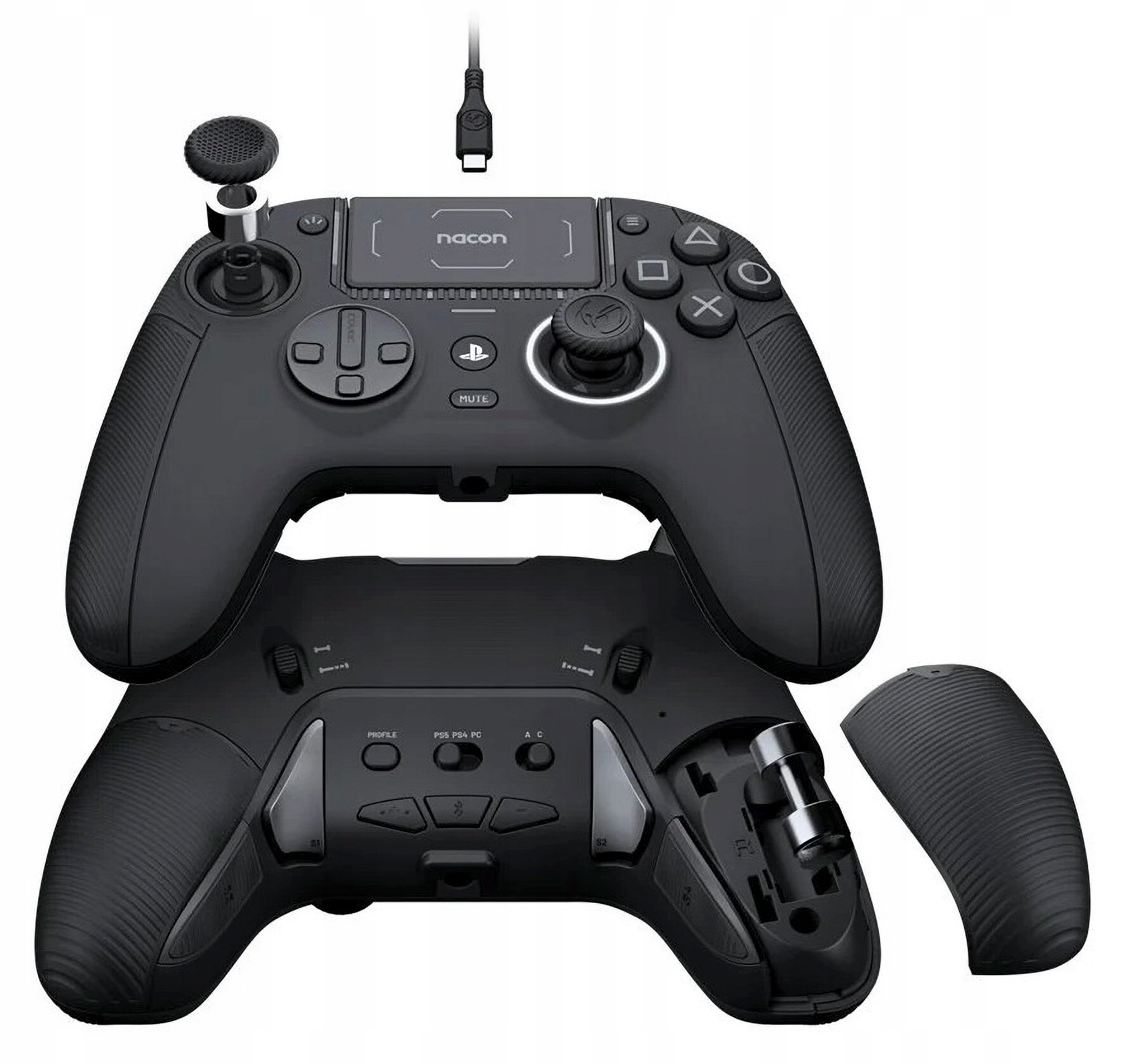Набір NACON Revolution 5 Pro включає високоякісний захисний чохол, кабель для зарядки USB-C/USB-C і набір взаємозамінних елементів, включаючи шість гир, чотири кільця, які змінюють рух аналогів, і шість аналогових наконечників. Загалом це дає понад 60 комбінацій персоналізації, тож ви можете точно налаштувати деталі відповідно до власних очікувань.