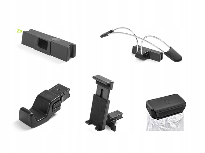 2 роз’єми для підголівників (3V0061128), вішалка для одягу (3V0061127), мультимедійний тримач (3V0061129) і чорний контейнер для сміття (5JA061107 9B9) .