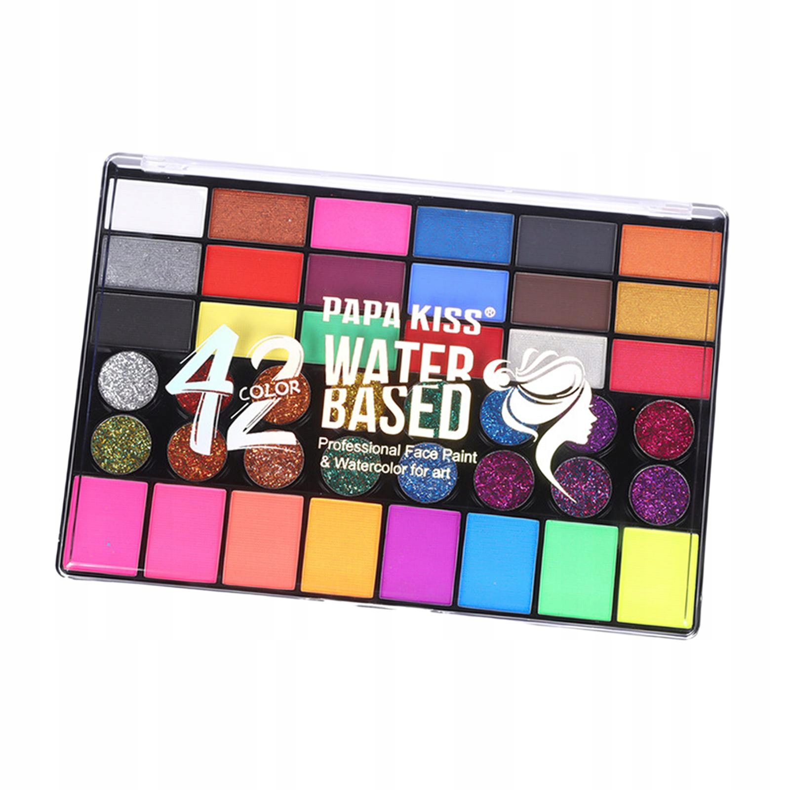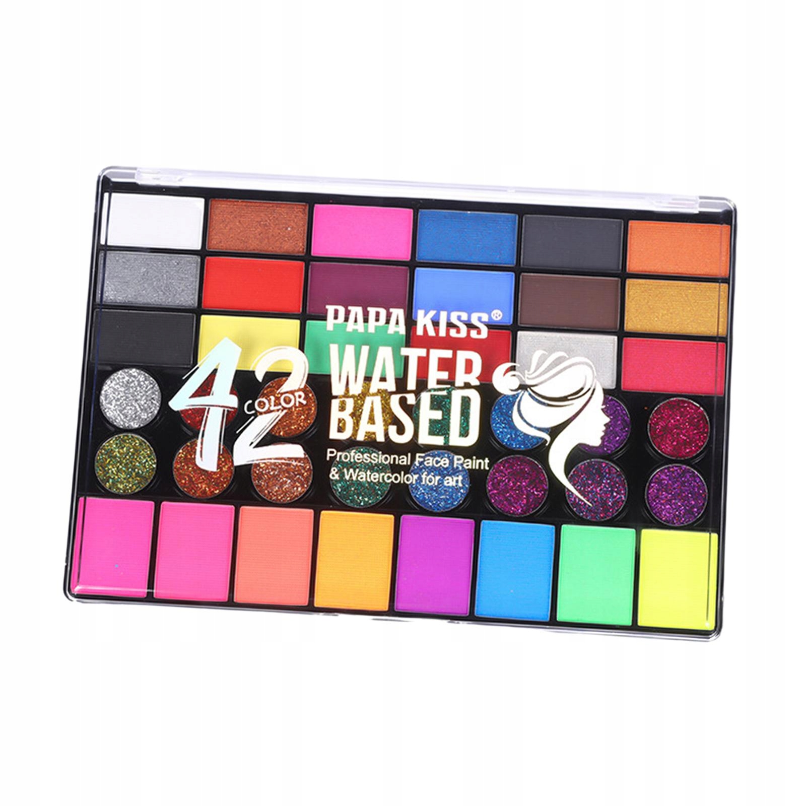 [42 Color Palette] Палітра фарб для обличчя та тіла наповнена 42 фарбами на водній основі (16 блискучих і 8 світяться в темряві) у зручній, міцній прозорій упаковці, яку легко наносити губкою або пензлем. Його можна використовувати для обличчя та тіла.