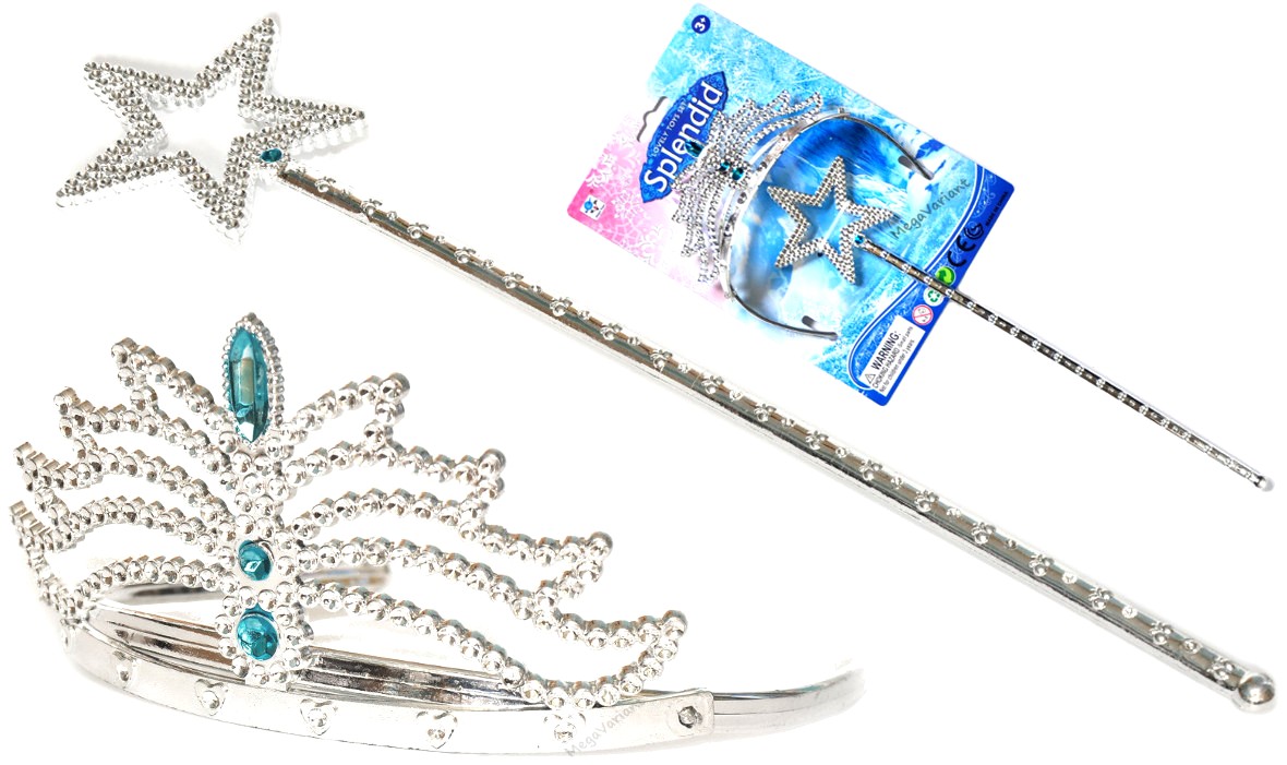 Набір КОРОЛЕВА ЕЛЬЗА з казки КРИЖАНЕ КРИЖАННЯ. Королівська діадема і жезл, усипаний красивими камінням крижано-блакитного кольору, ефектно доповнять всю фігуру маленької крижаної королеви. Для самостійної гри або як доповнення до костюма Ельзи, доступного на інших наших аукціонах.