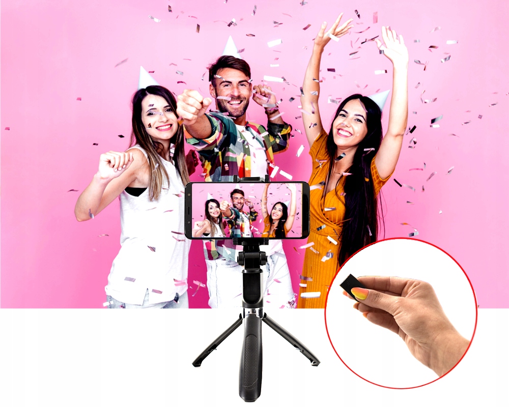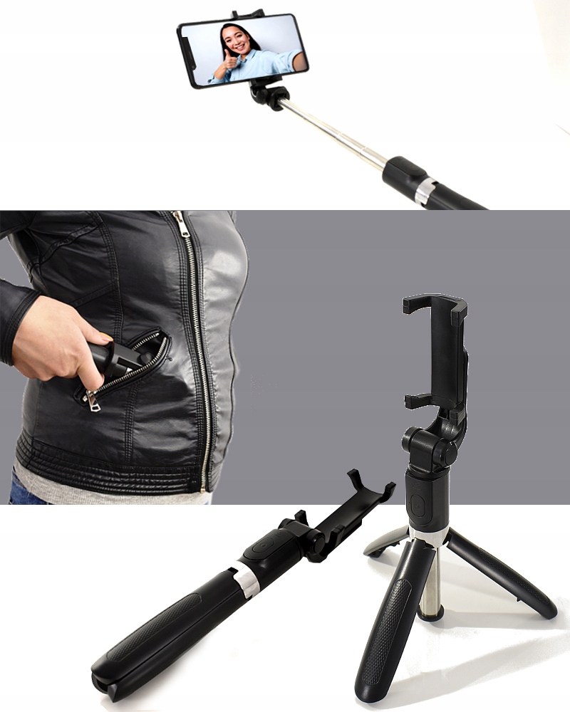 Штатив для палиці для селфі з пультом дистанційного керування Bluetooth — ідеальний гаджет для людей, які часто знімають прекрасні моменти життя за допомогою смартфона. Ручка виготовлена з алюмінію, поліуретану та твердого полікарбонату. Універсальний характер пристрою складається як з підключення Bluetooth, так і з висувної ручки. Ручка приладу розділена на три ніжки, які в розкладеному стані створюють якісний штатив, оснащений спеціальним неслизьким торцем. Пульт дистанційного керування, який є частиною набору, можна підключити до самої селфі-палки, а також використовувати як окремий елемент набору, наприклад, для запуску фотографій на відстані.