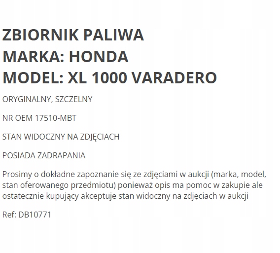 Просматривая «ТОПЛИВНЫЙ БАК HONDA XL 1000 XL1000 ВАРАДЕРО», вы можете быть уверены, что данный товар из каталога «Топливные баки» будет доставлен из Польши и проверен на целостность. В цене товара, указанной на сайте, учтена доставка из Польши. Внимание!!! Товары для Евросоюза, согласно законодательству стран Евросоюза, могут отличаться упаковкой или наполнением.