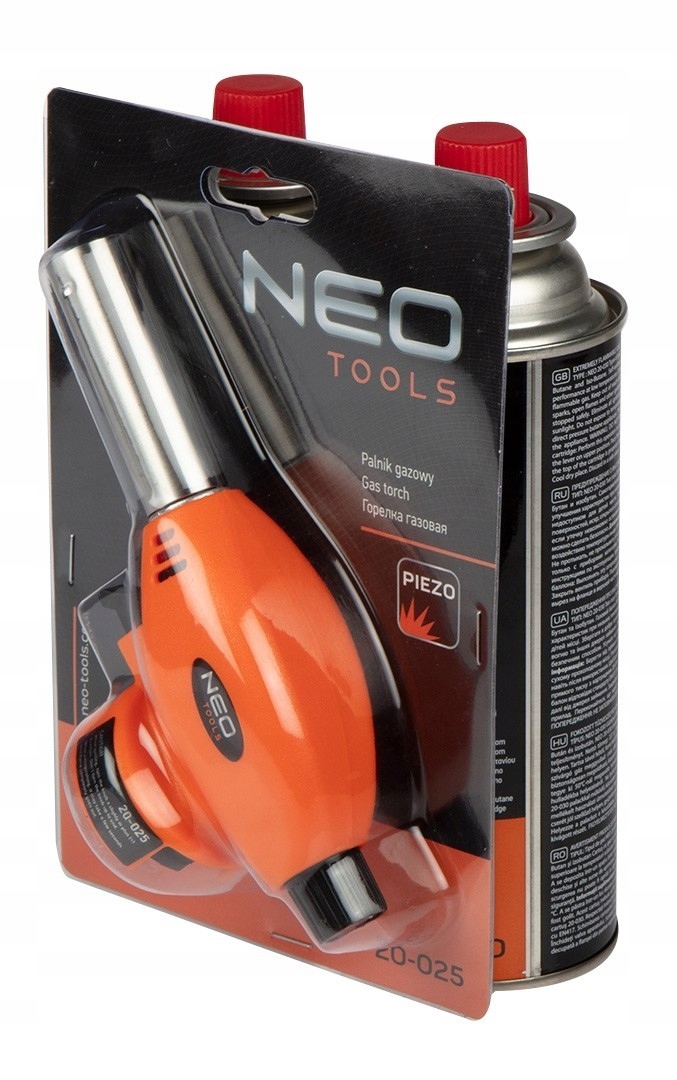 Гвинтовий газовий пальник NEO з картриджами 227 г (тип EN 417), робоча температура 1300°C, потужність 1,11 кВт. У набір входить два газових картриджа NEO бутан вагою 227 г. Пальник може працювати у вертикальному положенні (+/-80 градусів). Має п'єзорозпал, що дозволяє швидко включити лампу. Картридж для універсального використання, напр. у пажарних лампах або пічках.