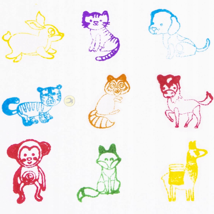 Творчий набір для дітей, що складається з 9 штампів із зображеннями улюблених тварин (собака, кінь, лама, кіт, єнот, лисиця, тигр, мавпа, кролик) ) , які можна друкувати на папері без використання додаткової чорнильної подушечки, є самофарбуючими. Відображені фігури різнокольорові. Крім того, ви можете прикрасити ними свої малюнки. Діти дуже охоче тягнуться до них і використовують у різноманітних творах. Марки знаходяться в зручній пластиковій коробці.