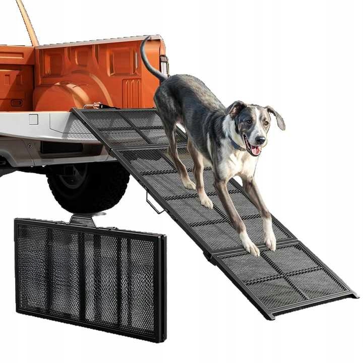 Сходи для пандуса для собак виготовлені з металу, кожна сходинка має несучу поперечну конструкцію, а подвійну металеву поперечну балку додано внизу середніх сходів, що підходить для всіх собак вагою до 400 фунтів.