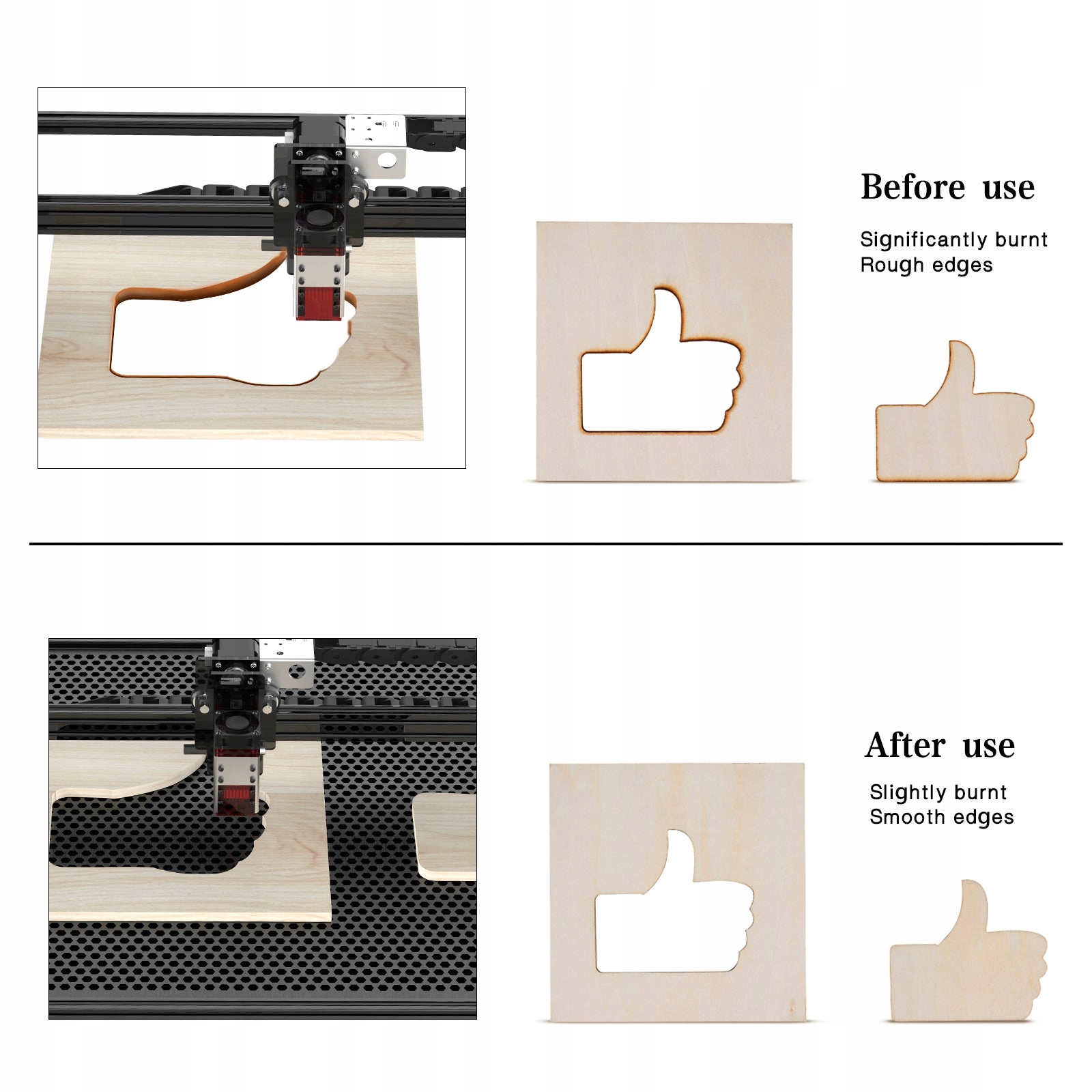 Товста, повністю металева конструкція: виконавчі столи з високоякісним алюмінієвим ядром з високоякісним ядром з створом та нижньою материнською плату, а також рамкою, виготовленою з оцинкованого заліза для конкретної міцної структури, що базується на освіті та русі. Пластина строни може бути надіслана для пошкодження лазерної головки лазерним відбиттям під час процесу, який розширює лазер.