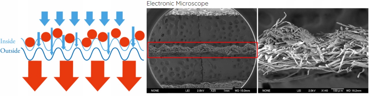 4 Поверхня цієї структури є найбільшою з усіх трьох типів спеціалізованих фільтрів кафе. Потік води можна підтримувати до самого кінця процесу пивоваріння, навіть якщо частинки кави з рукою осідають у внутрішній структурі паперу. Потік рідини робить чашку, що має об'єднаний, насичений смак .Структура паперу фільтрування під мікроскопом та графічним зображенням методу фільтрації: