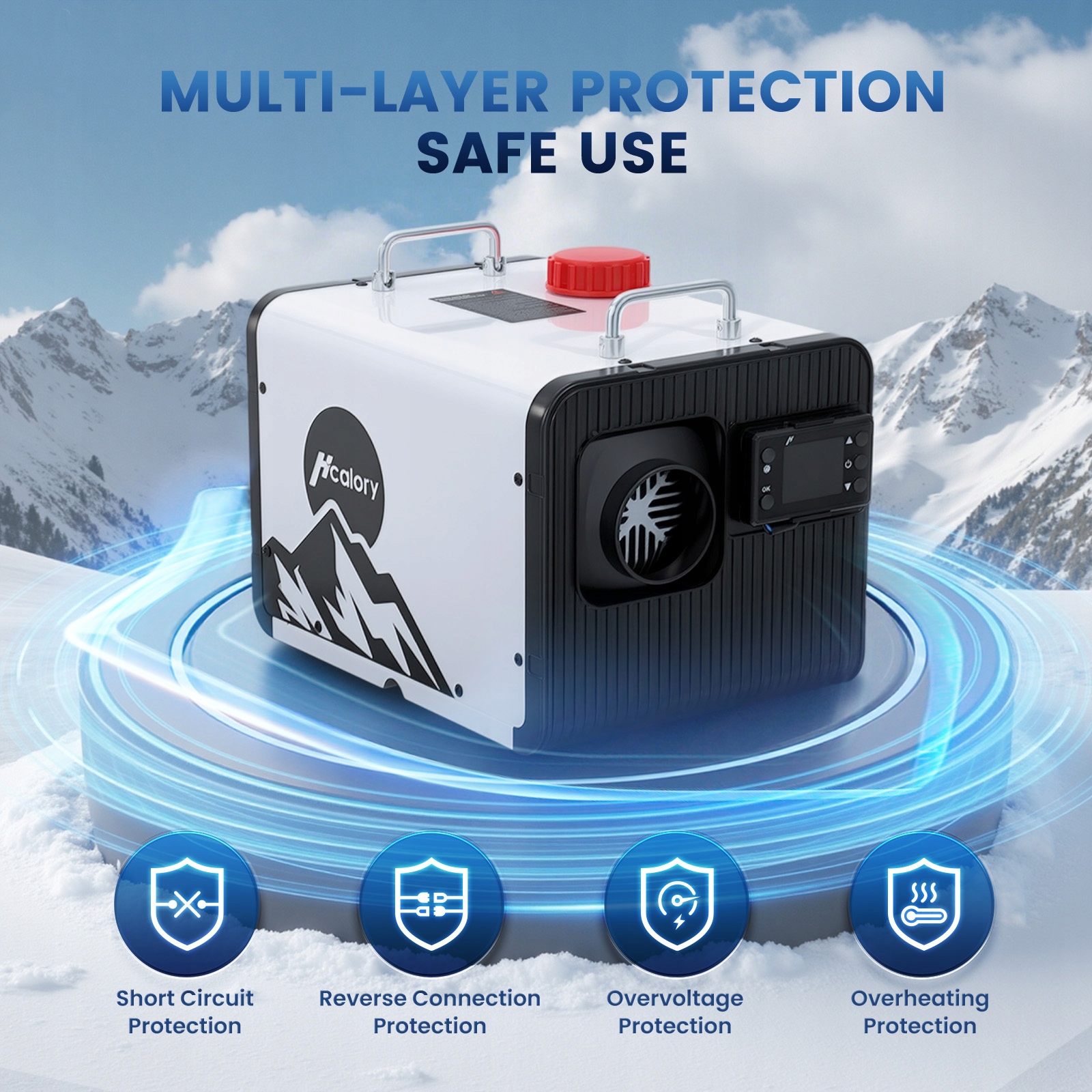Енергетична економія: нагрівач Hcalory 8 кВт з дизельним двигуном, модернізований у 2025 році, забезпечує підвищення ефективності нагрівання на 18% та 18% економії палива, забезпечуючи постійне та велике тепло в кімнатах з площею до 269 квадратних футів (приблизно 26 м²). Він досягає температури 50 ° C (122 ° F) всього за 3 хвилини, забезпечуючи комфортну та затишну температуру в транспортному засобі або яхті. Портативний повітряний нагрівач 8 кВт з 12 В дизельним двигуном