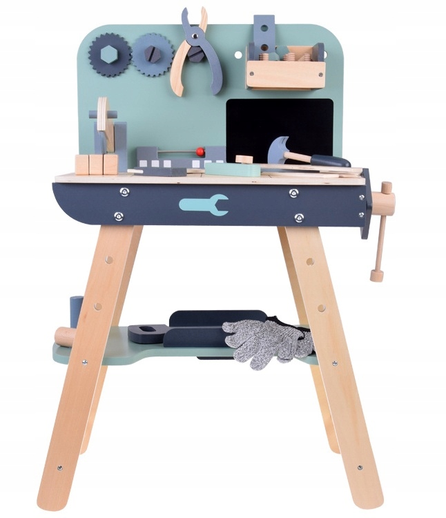Майстерня Artnico Toolerie виготовлена з високоякісної деревини, що робить її надзвичайно міцною та стійкою до пошкоджень. Поверхня покрита нетоксичною фарбою, безпечною для дітей, а всі елементи округлені та гладко відшліфовані, що мінімізує ризик порізів. Завдяки поєднанню натурального дерева з ледь помітними відтінками зеленого і темно-синього, майстерня не тільки розважить, але й прикрасить дитячу кімнату.