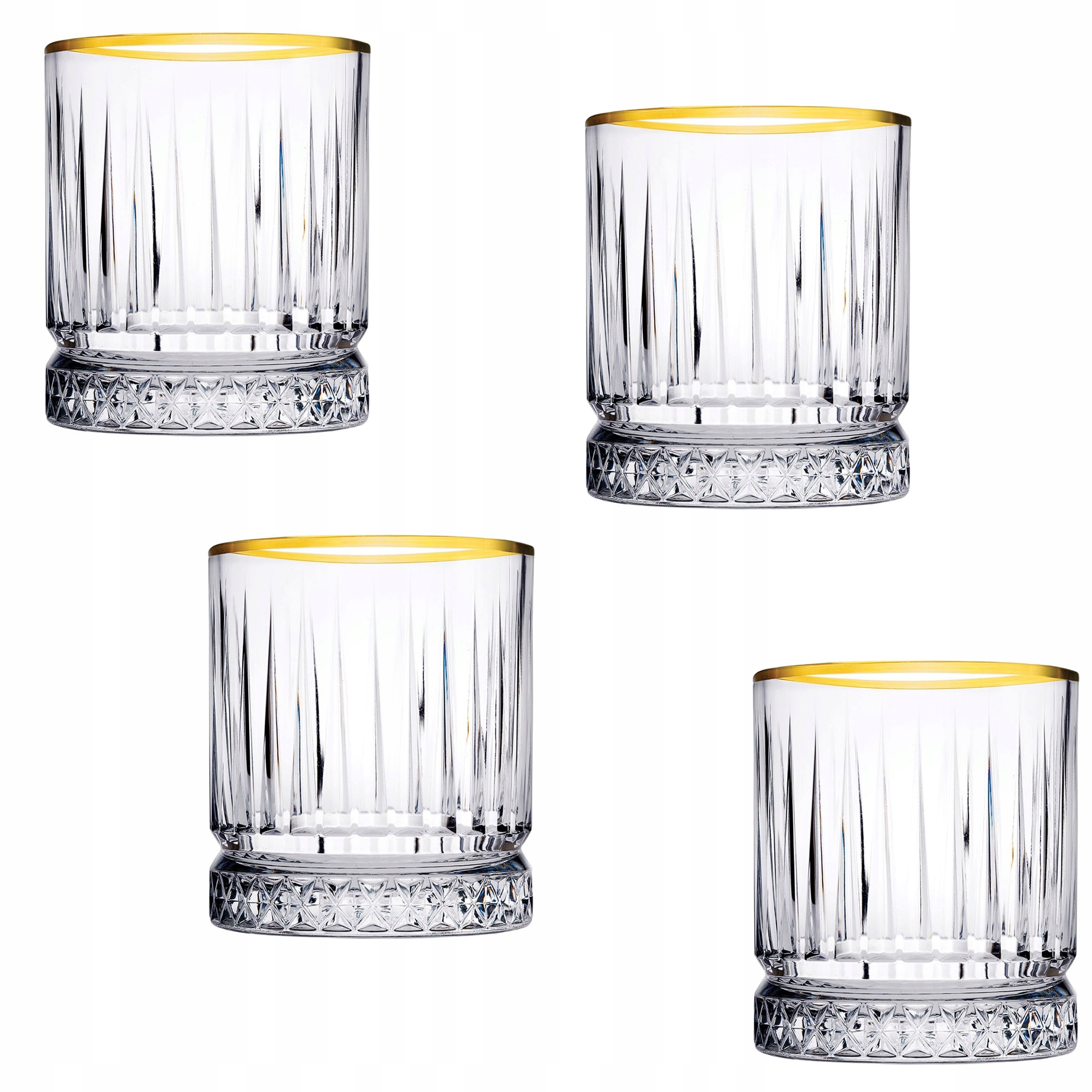 Набір з чотирьох келихів з колекції Elysia, які мають прикраси у вигляді грані, виготовленої на основі кристалів і золотого обідка. Ємність 355 мл дозволяє подавати безалкогольні напої, коктейлі або просто воду. Проста форма скла вражає своєю ергономічністю. Власники професійних закладів громадського харчування охоче використовують елементи колекції Elysia, оскільки вони ідеально вписуються в багато стилів інтер'єру. Завдяки золотій оправі, рекомендується мити келихи вручну.