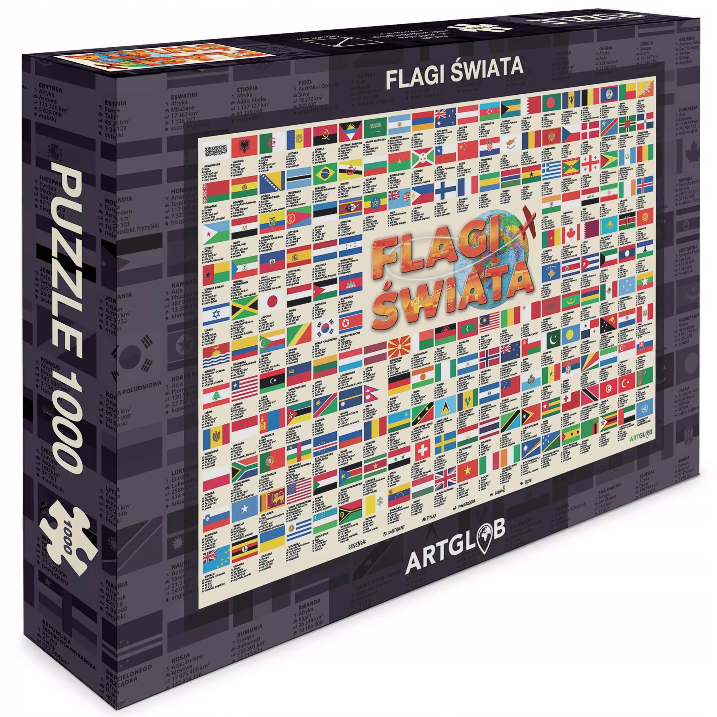 Вони, безсумнівно, стануть справжньою насолодою для всіх людей, спраглих знань, а також справжніх ентузіастів прапора. Розташувавши 1000 елементів, ви побачите різнокольорову графіку з розташованими в алфавітному порядку прапорцями розміром 66х47 см, і це ще не все! Під кожним із них ви також знайдете інформацію про пов’язані з ними країни, наприклад їхню столицю, населення, офіційну мову, територію та континент, на якому вони розташовані. Ми щиро віримо, що після вечорів, проведених за їх оформленням, запитання про поверхню Ватикану чи кольори, використані на прапорі США, стануть для вас дитячою забавкою. Пазл «Прапори світу» — це продукт, завдяки якому ви зможете легко та приємно отримувати нові знання, розвивати свої інтереси чи відпочивати після важкого робочого дня. Пазли з прапорцями світу - також оригінальна ідея для сімейного вечора. Якість, естетичність виготовлення та кількість елементів роблять ці пазли ідеальним подарунком для дорослих та дітей старшого віку.