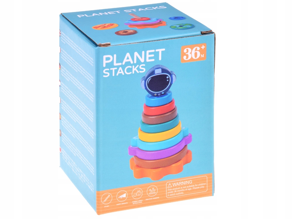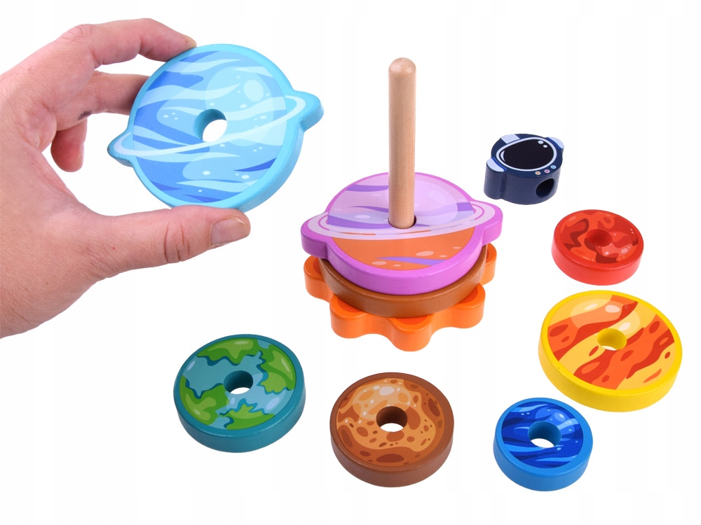 Розвиваюча дерев'яна пірамідка - ідеальна іграшка для розвитку ручних здібностей дитини. Завдання малюка - розкласти диски на основі - від найбільшого до найменшого. Завершенням піраміди є елемент у формі шолома космонавта. Все витримано в космічному стилі, диски - планети сонячної системи, а основа - Сонце. Під час гри дитина розвиває концентрацію, координацію очей і рук і дрібну моторику. Крім того, розвиває просторову уяву, вчить знаходити відмінності та порівнювати дані. Барвистий набір і цікава графіка викликають у дитини інтерес до іграшки. Набір неодмінно забезпечить багато годин неймовірного задоволення.