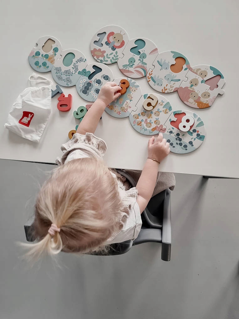 Пазли з дерев'яними цифрами серії Pure французького бренду JANOD - це великий (більше метра) пазл, який допоможе вашій дитині навчитися рахувати та розпізнавати числа від 1 до 10. Складається з 20 елементів: 10 круглих картонні пазли, які потрібно з’єднати між собою в правильному порядку та 10 дерев’яних просторових чисел, які потрібно розмістити у відповідних місцях на цих дошках для пазлів. На дошках, оформлених у пастельних тонах, також є чарівні ілюстрації комах (зокрема, цвіркунів, мурах, павуків і сонечок) у кількості, яка відповідає цифрі, яку потрібно розмістити на даному елементі. Великі розміри і прості форми дозволяють легко комбінувати елементи. У набір входить зручна сумка на шнурках для зберігання головоломки.