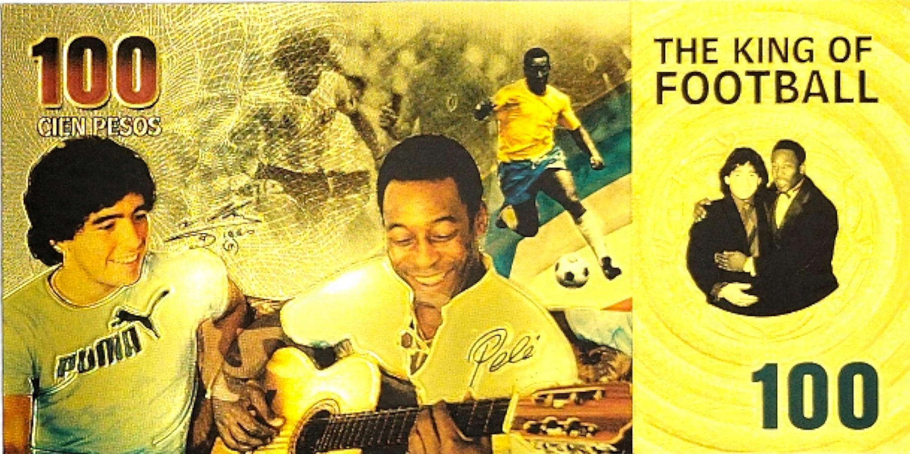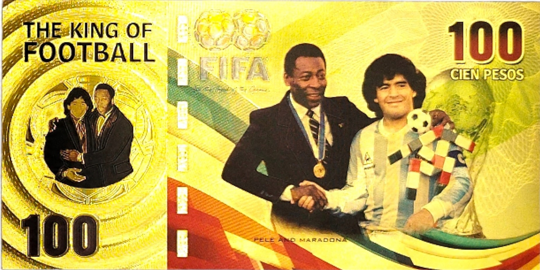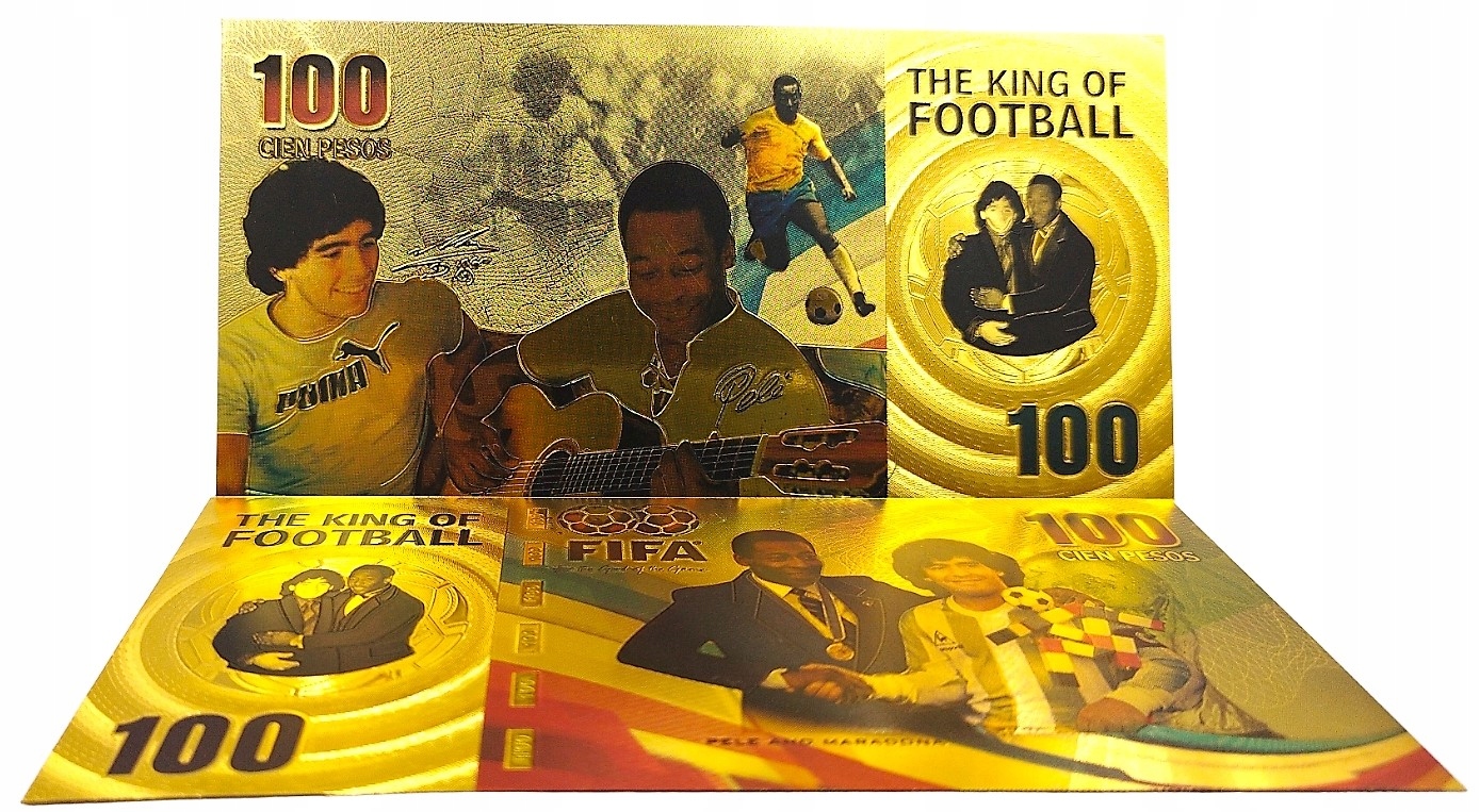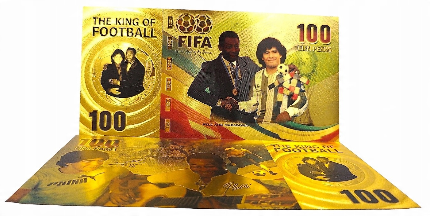 Красива позолочена банкнота із зображенням зірок світового футболу Пеле та Марадони.