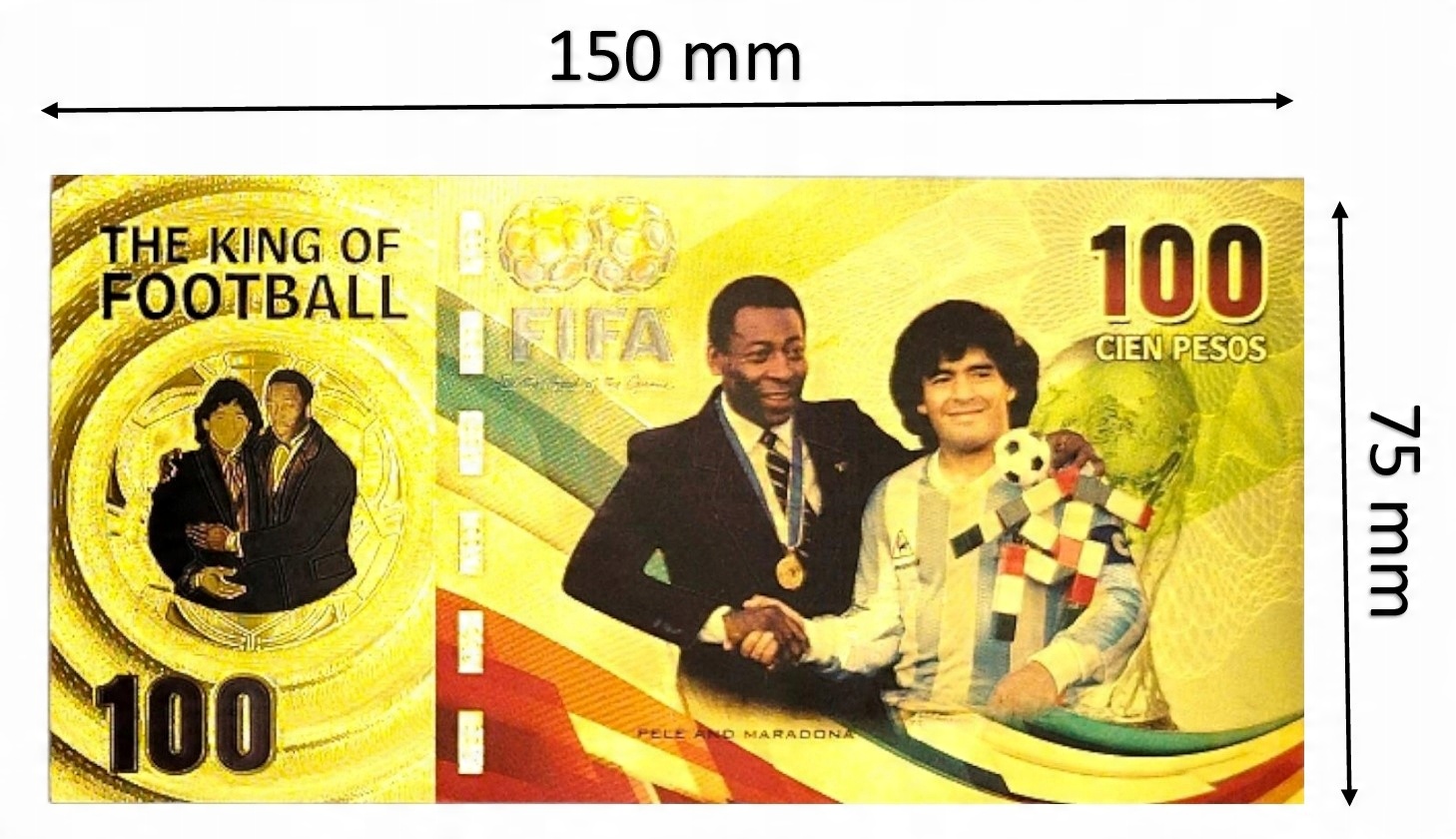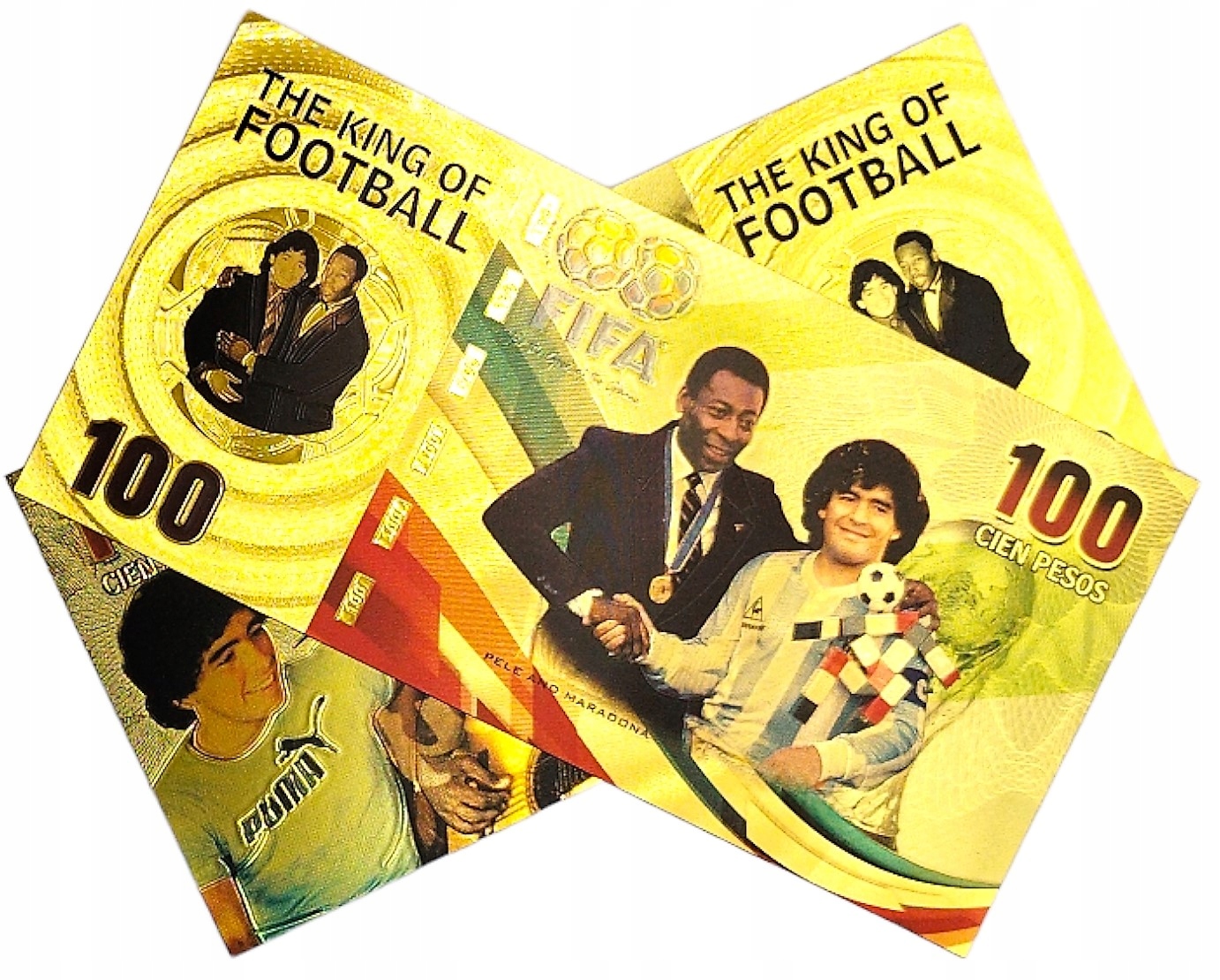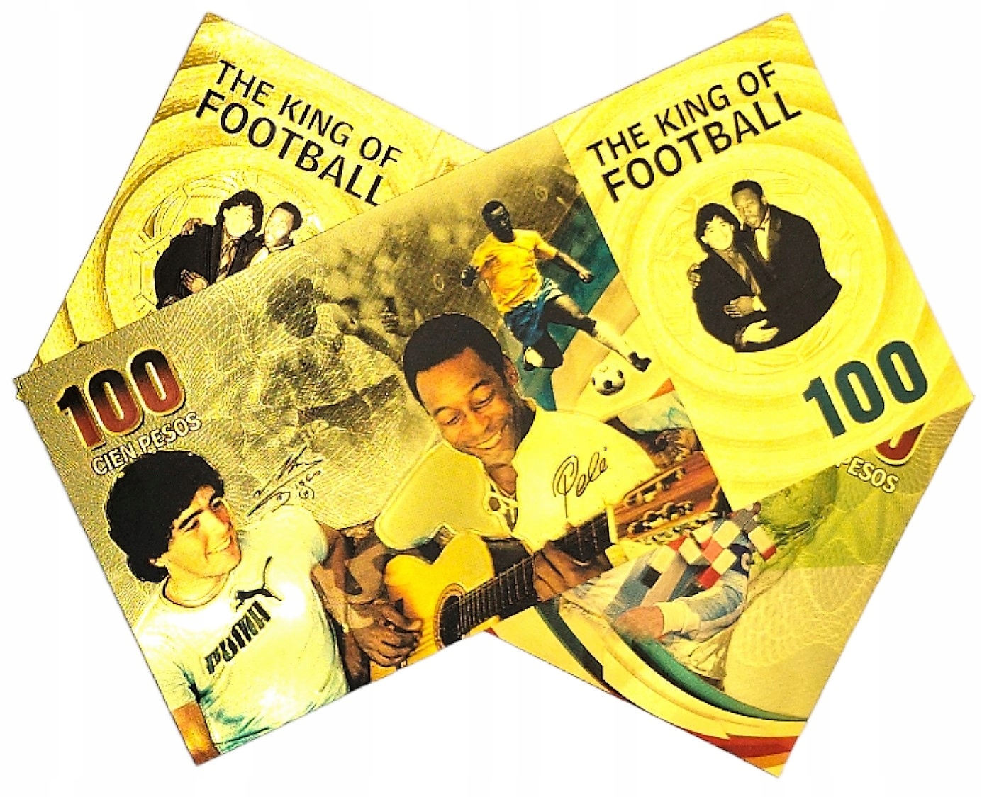 Красива позолочена банкнота із зображенням зірок світового футболу Пеле та Марадони.