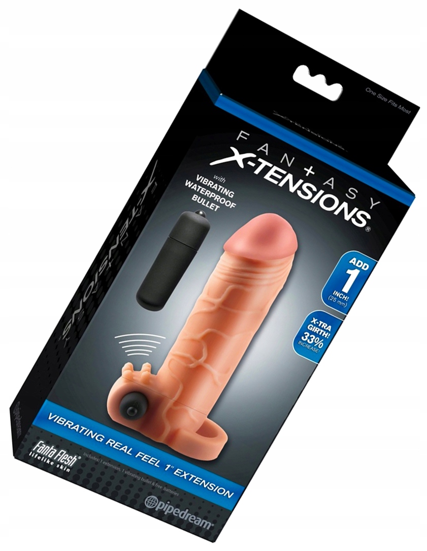 Чехол для пеніса, виготовлений із м’якого, схожого на шкіру матеріалу, що розтягується (Fanta Flesh), надає пенісу верхньої форми для задоволення моментів бажання. Щільно прилягаюча кришка для підтримки ерекції просто ковзає по ерегованому пенісу та, завдяки кільцю для яєчок, забезпечує надійну зручну посадку без ковзання. Завдяки великому зовнішньому діаметру пеніс на 33% більший окружність. А масивна головка подовжується на 2,5 см! Маленька потужна віброкуля вставляється у верхню петлю і забезпечує хвилююче поколювання додаткової стимуляції. Навіть у ванні чи душі, тому що він водонепроникний! Включно з батарейками (3 x LR44) для віброкулі.