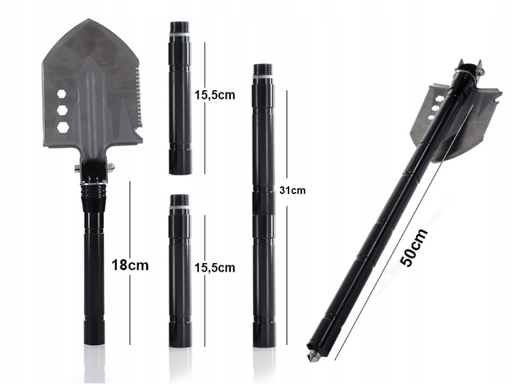 Ніж можна розмістити в кожному з елементів рукояті, а лопату можна притягнути лише до першого елемента (без різьби, що стирчить).
