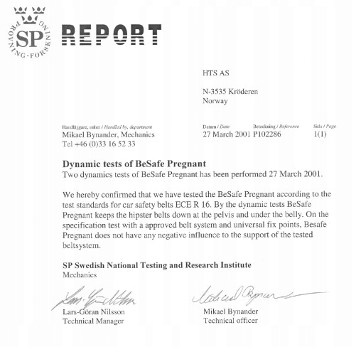 Цим ми підтверджуємо, що перевірили адаптер ременя безпеки BeSafe відповідно до стандарту тестування ременів безпеки в автокріслах ECE R 16. Згідно з динамічними випробуваннями, адаптер ременя безпеки BeSafe утримує поясні ремені на тазі та під животом. Специфікації тесту показують, що з’єднання адаптер ременя безпеки з ременями безпеки в автомобілі не має негативного впливу на функціональність ременів безпеки в автомобілі."