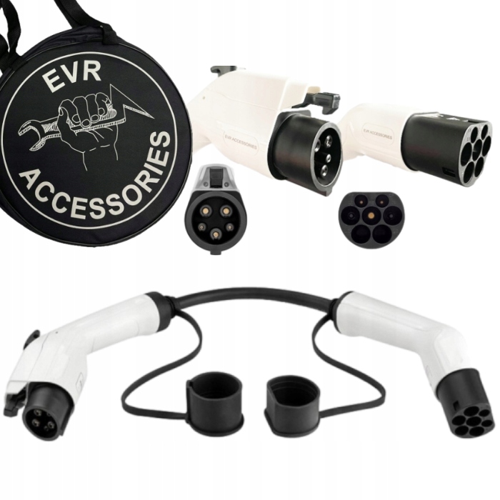 - Адаптер від виробника EVR Accessories оснащено роз’ємами, сумісними з IEC 62196 (вилка типу 2) і SAE J1772 (вилка типу 1).